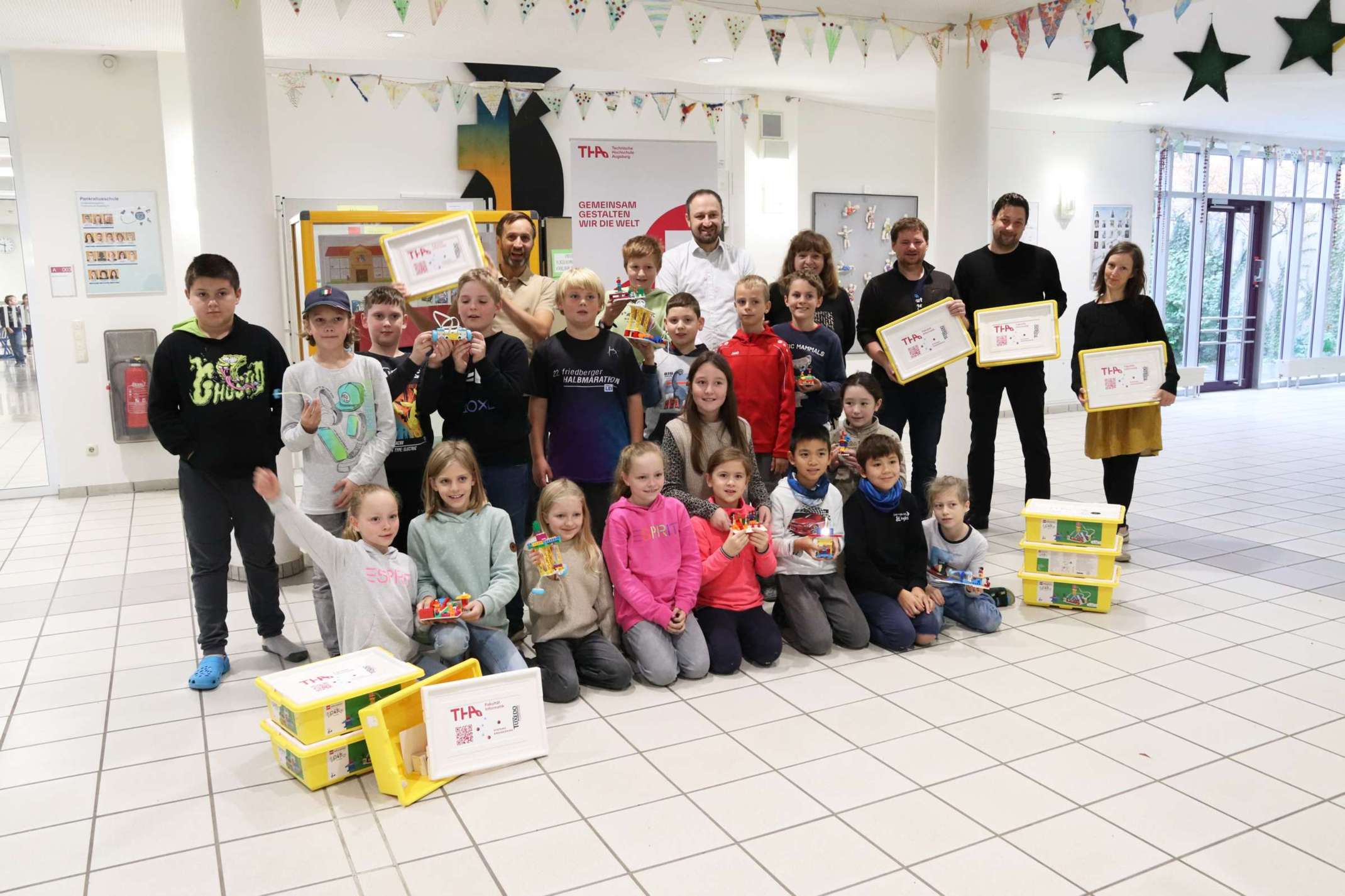 Die Schülerinnen und Schüler durften das Material unmittelbar ausprobieren. In der AG werden die teilnehmenden Kinder in den kommenden Monaten lernen und vor allem erfahren, wie man konzipiert, programmiert, konstruiert und testet. Prof. Wanninger erklärte: „Mit einer spielerischen Heranführung an MINT-Themen kann nicht früh genug begonnen werden, denn insbesondere in sehr jungen Jahren werden Kinder, je nach familiärem Hintergrund, in dieser Hinsicht unterschiedlich stark gefördert.“ Aus diesem Grund sind Prof. Wanninger und Prof. Kirchmeier mit ihrem Team aus dem Verbundprojekt „Digital und Regional“ regelmäßig an Schulen in Bayerisch-Schwaben zu Gast und versuchen, mit Vorträgen und gemeinsamen Projekten, Begeisterung für MINT-Fächer bei Schülerinnen und Schülern zu wecken.