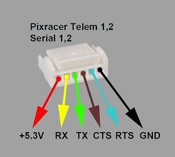 - Put this cable in the JST-GH connector at the location marked “TX”. This is the UART RX port of the PixRacer.