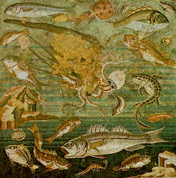 120 | fecundumque genus maenae lamirosque smarisqueatque immunda chromis, merito vilissima salpa,atque avium phycis nidos imitata sub undiset squamas tenui suffusus sanguine mullus,fulgentes soleae candore et concolor illis |