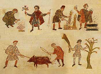 Omnino praevidendum est cum omni diligentia, ut quicquid manibus laboraverint aut fecerint, id est lardum, siccamen, sulcia, niusaltus, vinum, acetum, moratum, vinum coctum, garum, sinape, formaticum, butirum, bracios, cervisas, medum, mel, ceram, farinam, omnia cum summo nitore sint facta vel parata.