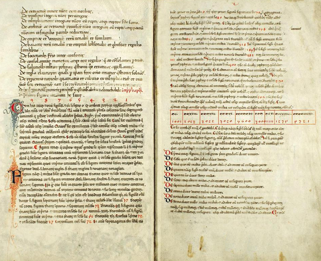 CUM his itaque novem figuris, et cum hoc signo 0, quod arabice zephirum appellatur, scribitur quilibet numerus, ut inferius demonstratur. Nam numerus est unitatum perfusa collectio sive congregatio unitatum, que per suos in infinitum ascendit gradus. Ex quibus primus ex unitatibus, que sunt ab uno usque in decem, constat. Secundus ex decenis, que sunt a decem usque in centum, fit. Tertius fit ex centenis que sunt a centum usque in mille. Quartus fit ex millenis que sunt a mille usque in decem milia, et sic sequentium graduum in infinitum, quilibet ex decuplo sui antecedentis constat. Primus gradus in descriptione numerorum incipit a destera. Secundus vero versus sinistram sequitur primum. Tertius secundum sequitur. Quartus tertium, et quintus quartum, et semper sic versus sinistram gradus gradum sequitur. Figura itaque que in primo reperitur gradu se ipsam representat, hoc est: si in primo gradu fuerit figura unitatis, unum representat; si binarii, duo; si ternarij, tria, et ita per ordinem que secuntur, usque si novenarij: novem figure quidem que in secundo gradu fuerit, tot decenas representant, quot in primo unitates; hoc est si figura unitatis secundum occupat gradum, denotat decem; si binarij, viginti; si ternarij, triginta; si novenarij, nonaginta.Figura namque que in tertio fuerit gradu, tot centenas denotat, quot in secundo decenas, vel in primo unitates, ut si figura unitatis centum; si binarij, ducenta; si ternarij, trecenta, et novenarij, nongenta. Ipsa igitur que fuerit in quarto gradu tot millenas quot in tertio centenas, aut in secundo decenas, vel in primo unitates denotat; et sic semper mutando gradum, numerus decuplando ascendit. Et ut hoc quod dictum est lucidius declarescat, ipsum cum figuris ostendatur. Si figura septenarij fuerit in primo gradu, et ternarij in secundo, ambe insimul 37 denotant; vel econtra:: figura ternarij in primo, et septenarij in secundo, 73 denotabunt. Item si figura quaternarij fuerit in primo, et unitatis in secundo sic 14, nimirum XIIII denotabunt: vel si figura unitatis fuerit in primo, et quaternarij in secundo sic 41, denotabunt XLI. Rursus in primo 72, et in secundo faciunt 27; contrarium enim facit 72. Si autem septuaginta tantum scribere voluerit, [fol. 2r] ponat in primo gradu 0, et post ipsum ponat figuram septenarii, sic 70; si octuaginta sequatur zephirum figuram octonarij sic 80: hac itaque demonstratione quemlibet numerum a decem usque in centum cum duabus figuris scribere potes. Cum tribus vero a centum scribitur usque in mille; ut si figura octonarii fuerit in primo, et quinarii in secundo, et unitatis in tertio 158, centum quinquaginta octo denotabunt; et econverso: si figura unitatis fuerit in primo, et quinarii in secundo, et octonarii in tertio 851, octigenta et quinquaginta unum denotabunt; vel econtra: si figura octonarii fuerit in primo, et unitatis in secundo, et quinarii in tertio, denotabunt 518. Item si permutatim figura quinarii fuerit in primo, octonarii in secundo, et unitatis in tertio, denotabunt 185. Item si figura unitatis fuerit in primo, octonarii in secundo, et quinarii in tertio, nimirum denotabunt 581: tres vero unitates sic 111, centum undecim faciunt. Verum si quinquaginta tantum scribere volueris, in primo et in secundo gradu ponas zephyra, et in tertio figuram quinarii hoc modo 500; et sic cum duobus zephyris quemlibet centenariorum numerum scribere poteris. Et si centenaria cum decenis sive unitatibus scribere volueris, ponas in primo gradu zephyrum, in secundo decenas, et in tertio centenas quas volueris. Verbi gratia: si in primo gradu fiat zephyrum, et in secundo figura novenarii, et in tertio binarii, denotabunt 290. Si autem absque decenis centenaria cum unitatibus scribere volueris, pones in secundo gradu, scilicet in loco decenarii zephyrum, et in primo numerum unitatum quem voluerit, et in tertio centenariorum: ut si in primo fuerit figura novenarii, et in secundo zephyrum, et in tertio binarii 209; et sic secundum supradictam demonstrationem qualem volueris, numerus a centum usque in mille scribes cum tribus figuris. Cum quattuor namque a mille usque in decem milia, ut in sequenti cum figuris numeris super notatis ostenditur.