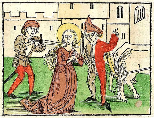 Volentes autem eam trahere, tanto pondere spiritus sanctus eam fixit, ut omnino eam movere nequirent. Fecitque Paschasius mille viros accedere et manus eius et pedes ligare, sed eam nullatenus poterant movere. Tunc et cum viris mille paria boum adhibuit. Sed tamen virgo immobilis permansit. Vocatis autem magis, ut suis incantationibus moveretur, omnino moveri non potuit. Tunc dixit Paschasius: «Quae sunt illa maleficia, quod una puella a mille viris non moveretur!'