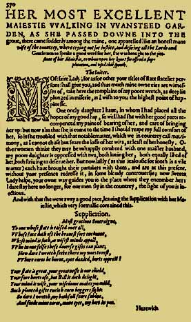 - Herewith the woman-suiter being gone, there was heard in the woods a confused noise & forth-with there came out six sheapheards with as many fosters hailing and pulling, to whether side they should draw the Ladie of May, who seemed to encline neither to the one or the other side. Among them was maister Rombus a schoolemaster of a village thereby, who being fully perswaded of his owne learned wisedome, came thither, with his authoritie to part their fray; where for aunswer he receiued many vnlearned blowes. But the Queene comming to the place where she was seene of them, though they knew not her estate, yet something there was which made them startle aside and gaze vpon her till old father Lalus stepped forth (one of the substantiallest shepheards) and making a legge or two, said these few words.