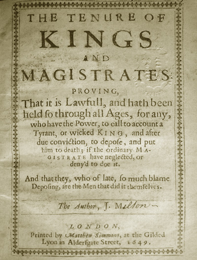 But of these I name no more, lest it bee objected they were Heathen; and come to produce another sort of men that had the knowledge of true Religion. Among the Jews this custom of tyrant-killing was not unusual. First Ehud, a man whom God had raysd to deliver Israel from Eglon King of Moab, who had conquerd and rul'd over them eighteene years, being sent to him as an Ambassador with a present, slew him in his own house. But hee was a forren Prince, an enemie, and Ehud besides had special warrant from God. To the first I answer, it imports not whether forren or native: For no Prince so native but professes to hold by Law; which when he himself overturns, breaking all the Covnants and Oaths that gave him title to his dignity, and were the bond and alliance between him and his people, what differs he from an outlandish King, or from an enemie? For look how much right the King of Spaine hath to govern us at all, so much right hath the King of England to govern us tyrannically. If he, though not bound to us by any League, comming from Spaine in person to subdue us or to destroy us, might lawfully by the people of England either bee slaine in fight, or put to death in captivity, what hath a native King to plead, bound by so many Covnants, benefits and honours to the welfare of his people, why he through the contempt of all Laws and Parlaments, the onely tie of our obedience to him, for his own wills sake, and a boasted prerogative unaccountable, after sev'n years warring and destroying of his best Subjects, overcom, and yeilded prisoner, should think to scape unquestionable, as a thing divine, in respect of whom so many thousand Christians destroy'd, should lie unaccounted for, polluting with their slaughterd carcasses all the Land over, and crying for vengeance against the living that should have righted them. Who knows not that there is a mutual bond of amity and brother-hood between man and man over all the World, neither is it the English Sea that can sever us from that duty and relation: a straiter bond yet there is between fellow-subjects, neighbours, and friends; But when any of these doe one to another so as hostility could doe no worse, what doth the Law decree less against them, then op'n enemies and invaders? or if the Law be not present, or too weake, what doth it warrant us to less then single defence, or civil warr? and from that time forward the Law of civil defensive warr differs nothing from the Law of forren hostility. Nor is it distance of place that makes enmitie, but enmity that makes distance. He therfore that keeps peace with me, neer or remote, of whatsoever Nation, is to mee as farr as all civil and human offices an Englishman and a neighbour: but if an Englishman forgetting all Laws, human, civil and religious, offend against life and liberty, to him offended and to the Law in his behalf, though born in the same womb, he is no better then a Turk, a Sarasin, a Heathen. This is Gospel, and this was ever Law among equals; how much rather then in force against any King whatever, who in respect of the people is confessd inferior and not equal: to distinguish therfore of a Tyrant by outlandish, or domestic is a weak evasion. To the second that he was an enemie, I answer, what Tyrant is not? yet Eglon by the Jewes had bin acknowledgd as thir Sovran; they had serv'd him eighteen yeares, as long almost as we our William the Conqueror, in all which time he could not be so unwise a Statesman but to have tak'n of them Oaths of Fealty and Allegeance, by which they made themselves his proper Subjects, as thir homage and present sent by Ehud testify'd. To the third, that he had special warrant to kill Eglon in that manner, it cannot bee granted, because not expressd; tis plain that he was raysd by God to be a Deliverer, and went on just principles, such as were then and ever held allowable, to deale so by a Tyrant that could no otherwise be dealt with. Neither did Samuel though a Profet, with his own hand abstain from Agag; a forren enemie no doubt; but mark the reason. As thy Sword hath made women childless; a cause that by the sentence of Law it self nullifies all relations. And as the Law is between Brother and Brother, Father and Son, Maister and Servant, wherfore not between King or rather Tyrant and People? And whereas Jehu had special command to slay Jehoram a successive and hereditarie Tyrant, it seems not the less imitable for that; for where a thing grounded so much on natural reason hath the addition of a command from God, what does it but establish the lawfulness of such an act. Nor is it likely that God who had so many wayes of punishing the house of Ahab would have sent a subject against his Prince, if the fact in it self, as don to a Tyrant, had bin of bad example. And if David refus'd to lift his hand against the Lords anointed, the matter between them was not tyranny, but privat enmity, and David as a privat person had bin his own revenger, not so much the peoples. But when any tyrant at this day can shew to be the Lords anointed, the onely mention'd reason why David withheld his hand, he may then but not till then presume on the same privilege.