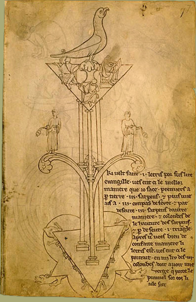 Ki velt faire .i. letris por sus lire evangille, ves ent ci le mellor maniere que io sace. premiers a p(ar)tierre .iij. sarpens, (et) puis une ais a .iij. conpas deseure, (et) par deseure .iji. sarpens d'autre maniere. (et) colonbes de le hauture des sarpens, (et) p(ar) deseure .i. tria(n)gle. Apres v(os) vees bien de confaite maniere li letris est; ves ent ci le portrait. En miliu des .iij. colonbes, doit avoir une verge, q(u)i porte le plumiel sor coi li aile siet.