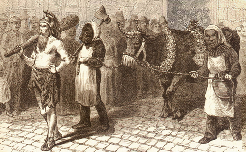 Wie man aber hier in dem unablässigen Gewühl und Ineinandergreifen der Bilder und Eindrücke keinen Augenblick bei einem Gedanken stehen bleiben kann, so komme ich denn, Du mußt es mir nicht übel nehmen, von Dir, wunderlich genug, auf den – Mardi gras. Das ist der Tag, an dem halb Paris auf den Beinen und der muthwilligsten Freude überlassen war. Das lieblichste Frühlingswetter begünstigte ihn. Bei einer auf dem Boulevard wohnenden Bekannten übersah ich das Ganze. Da war Kopf an Kopf, Wagen an Wagen, Reiter an Reiter, überall hübsch gruppirte Masken, die mit aller möglichen Grazie ihre Rollen behaupteten. Das französische Volk ist doch einzig in seiner Harmlosigkeit und ritterlichen Anmuth – man muß ihm gut seyn. Es sind kindische Kinder, die immer in der Entwicklungsperiode stehen bleiben. Um was drehen sich aber die Gedanken? Stille! Ein ungeheurer, prächtig geschmückter Mastochse, auf dem ein als Amor verkleideter Knabe sitzt, wird eben von vierzig Masken zu Pferd durch mehrere Theile der Stadt eskortirt. Die Musik lärmt durch die Luft – dann ein sechsspänniger Wagen, hoch oben ragt ein großer Mann, grauer Filzhut, offene Brust, herausgeschlagener Hemdkragen, in seiner Hand schwingt er eine große Tricolorfahne, zu seinen Füßen ruht Herkules mit der Keule, rings um ihn her alle Nationen in reicher Tracht, zuletzt ein Minister, mit Orden behangen, traulich neben ihm Harlequin und Columbine. Dann eine Cavalcade, aus Masken zu Pferde, zu Wagen, zu Fuß, tummeln sich einher. Ich sah herab auf eine bunte, sich langsam dahin wälzende Decke: dazu lachte, pfiff, sang und schrie Alles. Da lachte |