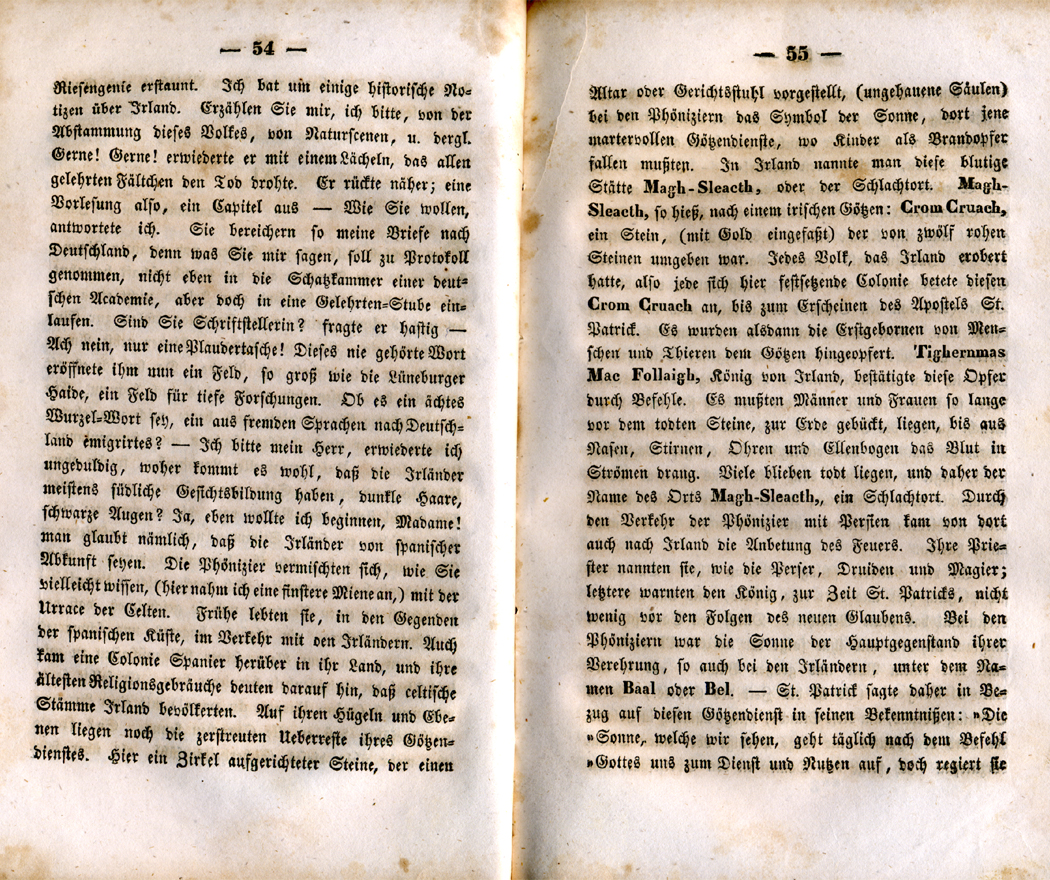 Riesengenie erstaunt. Ich bat um einige historische Notizen über Irland. Erzählen Sie mir, ich bitte, von der Abstammung dieses Volkes, von Naturscenen, u. dergl. Gerne! Gerne! erwiderte er mit einem Lächeln, das allen gelehrten Fältchen den Tod drohte. Er rückte näher; eine Vorlesung also, ein Capitel aus – Wie Sie wollen, ant­wortete ich. Sie bereichern so meine Briefe nach Deutsch­land, denn was Sie mir sagen, soll zu Protokoll genommen, nicht eben in die Schatzkammer einer deutschen Academie, aber doch in eine Gelehrten-Stube einlaufen. Sind Sie Schriftstellerin? fragte er hastig – Ach nein, nur eine Plaudertasche! Dieses nie gehörte Wort eröffnete ihm nun ein Feld, so groß wie die Lüneburger Haide, ein Feld für tiefe Forschungen. Ob es ein ächtes Wurzel-Wort sey, ein aus fremden Sprachen nach Deutschland emigrirtes? – Ich bitte mein Herr, erwiederte ich ungeduldig, woher kommt es wohl, daß die Irländer meistens südliche Gesichtsbildung haben, dunkle Haare, schwarze Augen? Ja, eben wollte ich beginnen, Madame! man glaubt nämlich, daß die Irländer von spanischer Abkunft seyen. Die Phönizier vermischten sich, wie Sie vielleicht wissen, (hier nahm ich eine finstere Miene an,) mit der Urrace der Celten. Frühe lebten sie, in den Gegenden der spanischen Küste, im Verkehr mit den Irländern. Auch kam eine Co­lonie Spanier herüber in ihr Land, und ihre ältesten Reli­gionsgebräuche deuten darauf hin, daß Keltische Stämme Irland  bevölkerten.  Auf  ihren Hügeln  und  Ebe­nen  liegen  noch  die  zerstreuten  Überreste  ihres  Götzen­dienstes. Hier  ein Zirkel  aufgerichteter  Steine,  der  einen