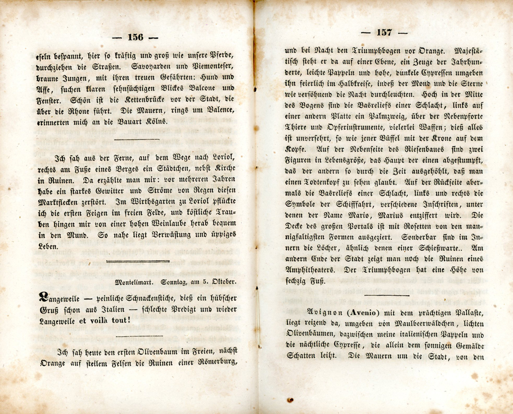 eseln bespannt, hier so kräftig und groß wie unsere Pferde, durchziehen die Straßen. Savoyarden und Piemonteser, braune Jungen, mit ihren treuen Gefährten: Hund und Affe, suchen klaren sehnsüchtigen Blickes Balcone und Fenster. Schön ist die Kettenbrücke vor der Stadt, die über die Rhone führt. Die Mauern, rings um Valence, erinnerten mich an die Bauart Kölns.―――――Ich sah aus der Ferne, auf dem Wege nach Loriol, rechts am Fuße eines Berges ein Städtchen, nebst Kirche in Ruinen. Da erzählte man mir: vor mehreren Jahren habe ein starkes Gewitter und Ströme von Regen diesen Marktflecken zerstört. Im Wirthsgarten zu Loriol pflückte ich die ersten Feigen im freien Felde, und köstliche Trauben hingen mir von einer hohen Weinlaube herab bequem in den Mund. So nahe liegt Verwüstung und üppiges Leben.―――――Montelimart. Sonntag, am 5. Oktober.Langeweile – peinliche Schnackenstiche, dieß ein hübscher Gruß schon aus Italien – schlechte Predigt und wieder Langeweile et voilà tout!―――――Ich sah heute den ersten Olivenbaum im Freien, nächst Orange auf steilem Felsen die Ruinen einer Römerburg, |