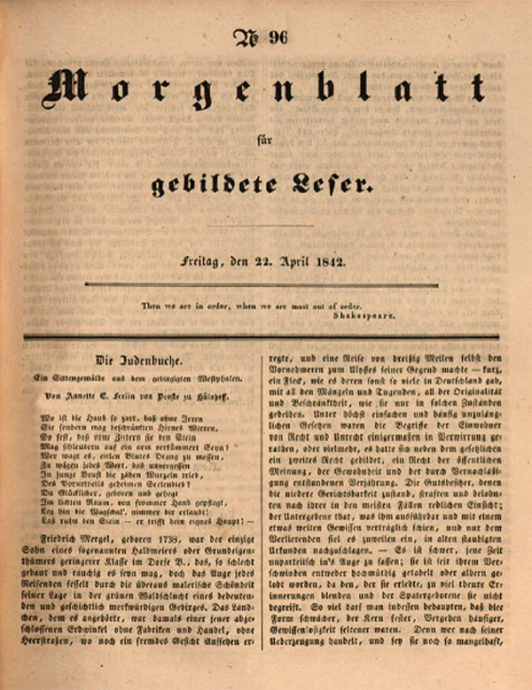 Faksimile der ersten Seite der «Judenbuche» im «Morgenblatt für gebildete Leser» (1842) |