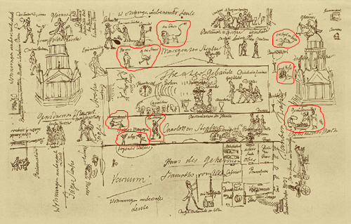 Allerhand weitere Personen, Tiere und eine Rose sind über die Zeichnung vertreut: ein Hund, ein leibhaftiger Nemo, ein Vogel Strauß, zwei Straßenmusikanten spielen einen Walzer, ein Soldat, ein Löwe, die Gemüseweiber vom Gendarmenmarkt, ein Vogel im Fluge und eine Rose.