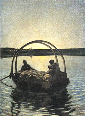 In erster Fassung entstand damals ein Bild, dessen Sujet der Künstler später wieder aufgenommen und zur vollen Ausgestaltung gebracht hat: «Ave Maria a trasbordo». Eine müde Ruhe liegt über diesem Bilde. Der Mann im Boot läßt die Ruder still liegen; die Frau mit dem Kinde im Arme scheint im Schlummer versunken. Die Schafherde, die das Fahrzeug füllt, drängt nach der dem Beschauer zugekehrten Seite, aber die Rücken der Tiere bilden eine nur wenig bewegte Fläche. Über dem Ganzen liegt die Beleuchtung des Sonnenunterganges, der Friede des Abends.