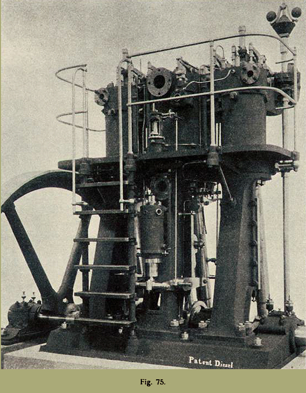 Da die konstruktiven Einzelheiten der Compoundmaschine, soweit die Verbrennungszylinder in Betracht kamen, genau diejenigen des Einzylindermotors entsprachen, und da die ganze Anordnung nicht zu praktischer Bedeutung gelangte, so unterlasse ich es an dieser Stelle, Ausführungszeichnungen wiederzugeben, aber die Figuren 74 und 75 geben photographische Ansichten dieser Maschine von verschiedenen Seiten und Fig. 76 zeigt sie im Laboratorium neben dem Einzylinderversuchsmotor. [134]