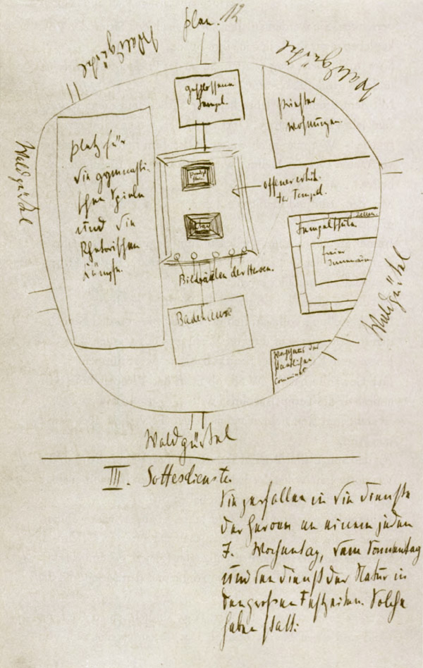 Der Tempel liegt in einem großen Waldgürtel. Auf eine Meile im Umkreise wohne kein anderes Leben. Auf je 500000 Menschen komme ein Tempel. An dem Rande des Tempelbezirks liegen die Bahnhöfe, die Gasthäuser.Betritt ein Mensch den Bezirk, so entledige er sich seiner Kleider. - Schon der Wald um den Tempel ist heilig. - Man gibt ihm eine weiße Toga und einen Epheukranz in das Haar. An dem Walde werde nichts verletzt. Keine Axt berühre ihn. Nur die Wege zu dem Tempel bleiben frei.Zu dem Plan: Es wird Sache des Staates sein, die Zahl der Priester so einzuschränken, daß keiner zu viel, keiner zu wenig sei.Man nehme das edelste Blut des Landes.