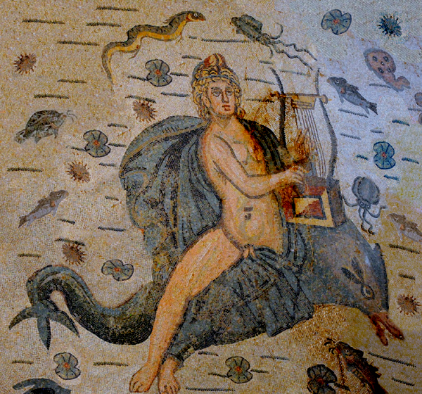 XXIV. [1] τοῦτον τὸν Ἀρίονα λέγουσι, τὸν πολλὸν τοῦ χρόνου διατρίβοντα παρὰ Περιάνδρωι ἐπιθυμῆσαι πλῶσαι ἐς Ἰταλίην τε καὶ Σικελίην, ἐργασάμενον δὲ χρήματα μεγάλα θελῆσαι ὀπίσω ἐς Κόρινθον ἀπικέσθαι. [2] ὁρμᾶσθαι μέν νυν ἐκ Τάραντος, πιστεύοντα δὲ οὐδαμοῖσι μᾶλλον ἢ Κορινθίοισι μισθώσασθαι πλοῖον ἀνδρῶν Κορινθίων. τοὺς δὲ ἐν τῶι πελάγεϊ ἐπιβουλεύειν τὸν Ἀρίονα ἐκβαλόντας ἔχειν τὰ χρήματα. τὸν δὲ συνέντα τοῦτο λίσσεσθαι, χρήματα μὲν σφι προϊέντα, ψυχὴν δὲ παραιτεόμενον. [3] οὔκων δὴ πείθειν αὐτὸν τούτοισι, ἀλλὰ κελεύειν τοὺς πορθμέας ἢ αὐτὸν διαχρᾶσθαί μιν, ὡς ἂν ταφῆς ἐν γῆι τύχηι, ἢ ἐκπηδᾶν ἐς τὴν θάλασσαν τὴν ταχίστην· [4] ἀπειληθέντα δὴ τὸν Ἀρίονα ἐς ἀπορίην παραιτήσασθαι, ἐπειδή σφι οὕτω δοκέοι, περιιδεῖν αὐτὸν ἐν τῆι σκευῆι πάσηι στάντα ἐν τοῖσι ἑδωλίοισι ἀεῖσαι· ἀείσας δὲ ὑπεδέκετο ἑωυτὸν κατεργάσασθαι. [5] καὶ τοῖσι ἐσελθεῖν γὰρ ἡδονὴν εἰ μέλλοιεν ἀκούσεσθαι τοῦ ἀρίστου ἀνθρώπων ἀοιδοῦ, ἀναχωρῆσαι ἐκ τῆς πρύμνης ἐς μέσην νέα. τὸν δὲ ἐνδύντα τε πᾶσαν τὴν σκευὴν καὶ λαβόντα τὴν κιθάρην, στάντα ἐν τοῖσι ἑδωλίοισι διεξελθεῖν νόμον τὸν ὄρθιον, τελευτῶντος δὲ τοῦ νόμου ῥῖψαί μιν ἐς τὴν θάλασσαν ἑωυτὸν ὡς εἶχε σὺν τῆι σκευῆι πάσηι. [6] καὶ τοὺς μὲν ἀποπλέειν ἐς Κόρινθον, τὸν δὲ δελφῖνα λέγουσι ὑπολαβόντα ἐξενεῖκαι ἐπὶ Ταίναρον. ἀποβάντα δέ αὐτὸν χωρέειν ἐς Κόρινθον σὺν τῆι σκευῆι, καὶ ἀπικόμενον ἀπηγέεσθαι πᾶν τὸ γεγονός. [7] Περίανδρον δὲ ὑπὸ ἀπιστίης Ἀρίονα μὲν ἐν φυλακῆι ἔχειν οὐδαμῆι μετιέντα, ἀνακῶς δὲ ἔχειν τῶν πορθμέων. ὡς δὲ ἄρα παρεῖναι αὐτούς, κληθέντας ἱστορέεσθαι εἴ τι λέγοιεν περὶ Ἀρίονος. φαμένων δὲ ἐκείνων ὡς εἴη τε σῶς περὶ Ἰταλίην καί μιν εὖ πρήσσοντα λίποιεν ἐν Τάραντι, ἐπιφανῆναί σφι τὸν Ἀρίονα ὥσπερ ἔχων ἐξεπήδησε· καὶ τοὺς ἐκπλαγέντας οὐκ ἔχειν ἔτι ἐλεγχομένους ἀρνέεσθαι. [8] ταῦτα μέν νυν Κορίνθιοί τε καὶ Λέσβιοι λέγουσι, καὶ Ἀρίονος ἐστὶ ἀνάθημα χάλκεον οὐ μέγα ἐπὶ Ταινάρωι, ἐπὶ δελφῖνος ἐπὲων ἄνθρωπος.