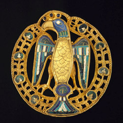 340 | Et superadditur his regine fibula grandis,In limo fusa, non malleolis fabricataFabrili nullo compacta ve machinamento,Per totum solida, non omninoque dolata.In medio cuius aquile stat imago volanti(s,) |