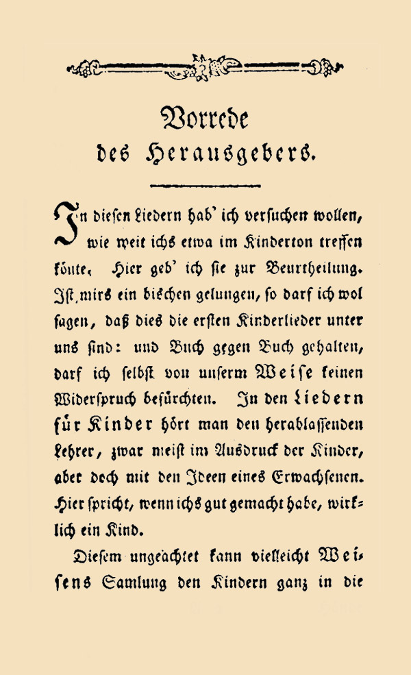 In diesen Liedern hab' ich versuchen wollen, wie weit ichs etwa im Kinderton treffen könte. Hier geb' ich sie zur Beurtheilung. Ist mirs ein bischen gelungen, so darf ich wol sagen, daß dies die ersten Kinderlieder unter uns sind: und Buch gegen Buch gehalten, darf ich selbst vou unserm WEISE keinen Widerspruch befürchten. In den "Liedern für Kinder" hört man den herablassenden Lehrer, zwar meist im Ausdruck der Kinder, aber doch mit den Ideen eines Erwachsenen. Hier spricht, wenn ichs gut gemacht habe, wirklich ein Kind.