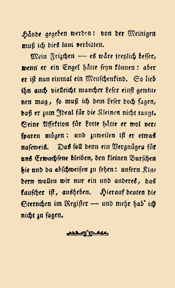 Mein Frizchen – es wäre freylich besser, wenn er ein Engel hätte seyn können: aber er ist nun einmal ein Menschenkind. So lieb ihn auch vielleicht mancher Leser einst gewinnen mag, so muß ich dem Leser doch sagen, daß er zum Ideal für die Kleinen nicht taugt. Seine Affektion für Lotte hätte er wol versparen mögen: und zuweilen ist er etwas naseweis. Das soll denn ein Vergnügen für uns Erwachsene bleiben, den kleinen Burschen hie und da abschweifen zu sehen: unsern Kindern wollen wir nur ein und anderes, das kauscher ist, [her]ausheben. Hierauf deuten die Sternchen im Register – und mehr hab' ich nicht zu sagen.