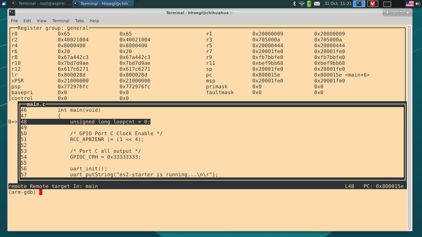 Man kann die Binärdatei von gitlab herunterladen und in einen Ordner legen, in dem ausführbare Dateien gefunden werden (Hinweis: Die PATH Umgebungsvariable muss diesen Ordner enthalten). In dem jeweiligen “Step” Ordner gibt man einfach das Kommando ogdb ein, damit wird der OpenOCD automatisch im Hintergrund gestartet und der GDB im TUI-Modus geöffnet. Dann sollte wie gewohnt das Debuggen in GDB möglich sein.