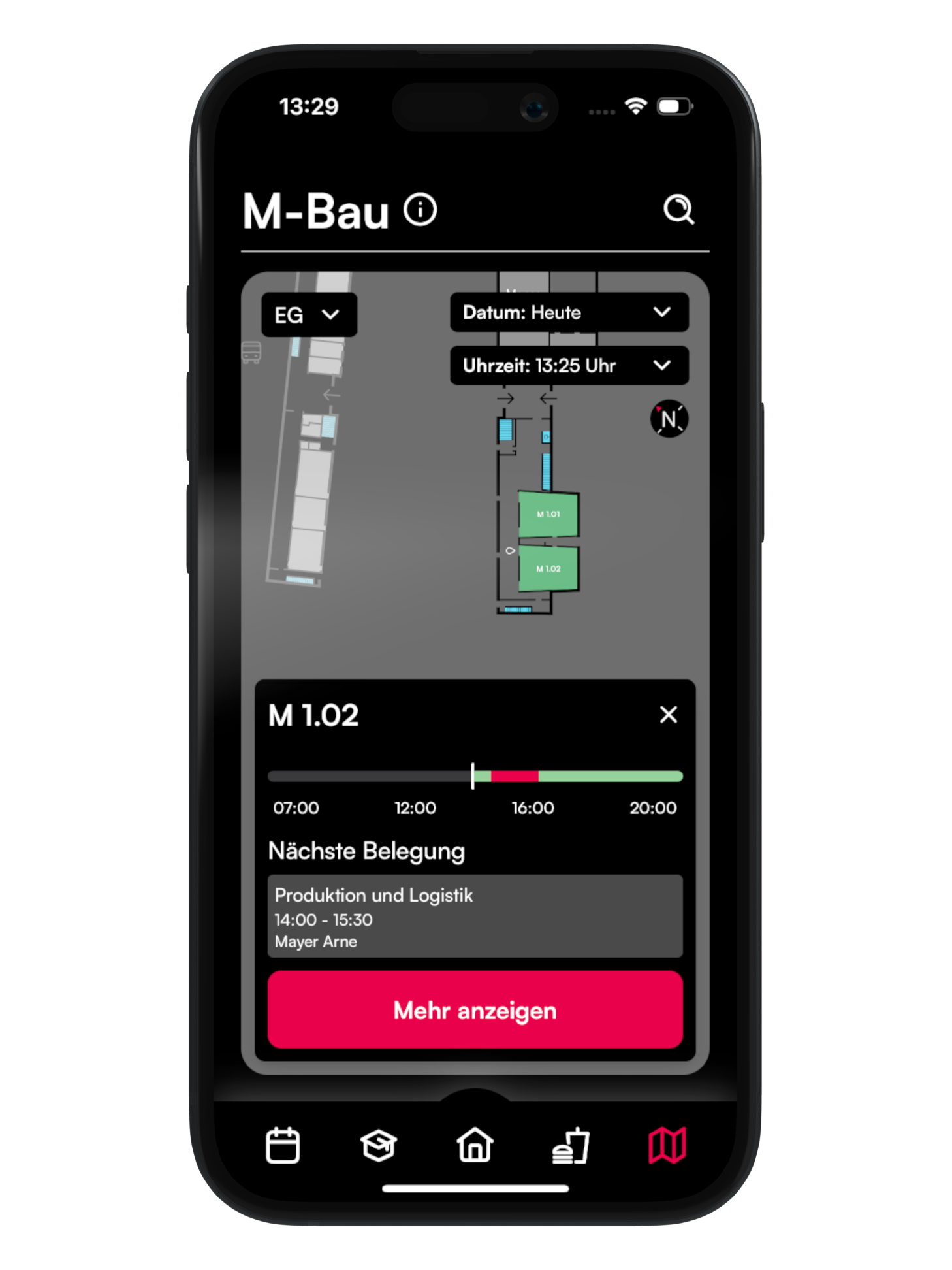 - Unsere Campus App wächst – und wird immer praktischer: Ab sofort zeigt sie nicht nur den Lageplan, sondern auch die aktuelle und zukünftige Raumbelegung. Das macht es für Studierende kinderleicht, spontan Lernräume zu finden, und gibt Lehrenden die Möglichkeit, bei Gruppenarbeiten oder kurzfristig größerem Platzbedarf direkt einen passenden Raum zu wählen.
