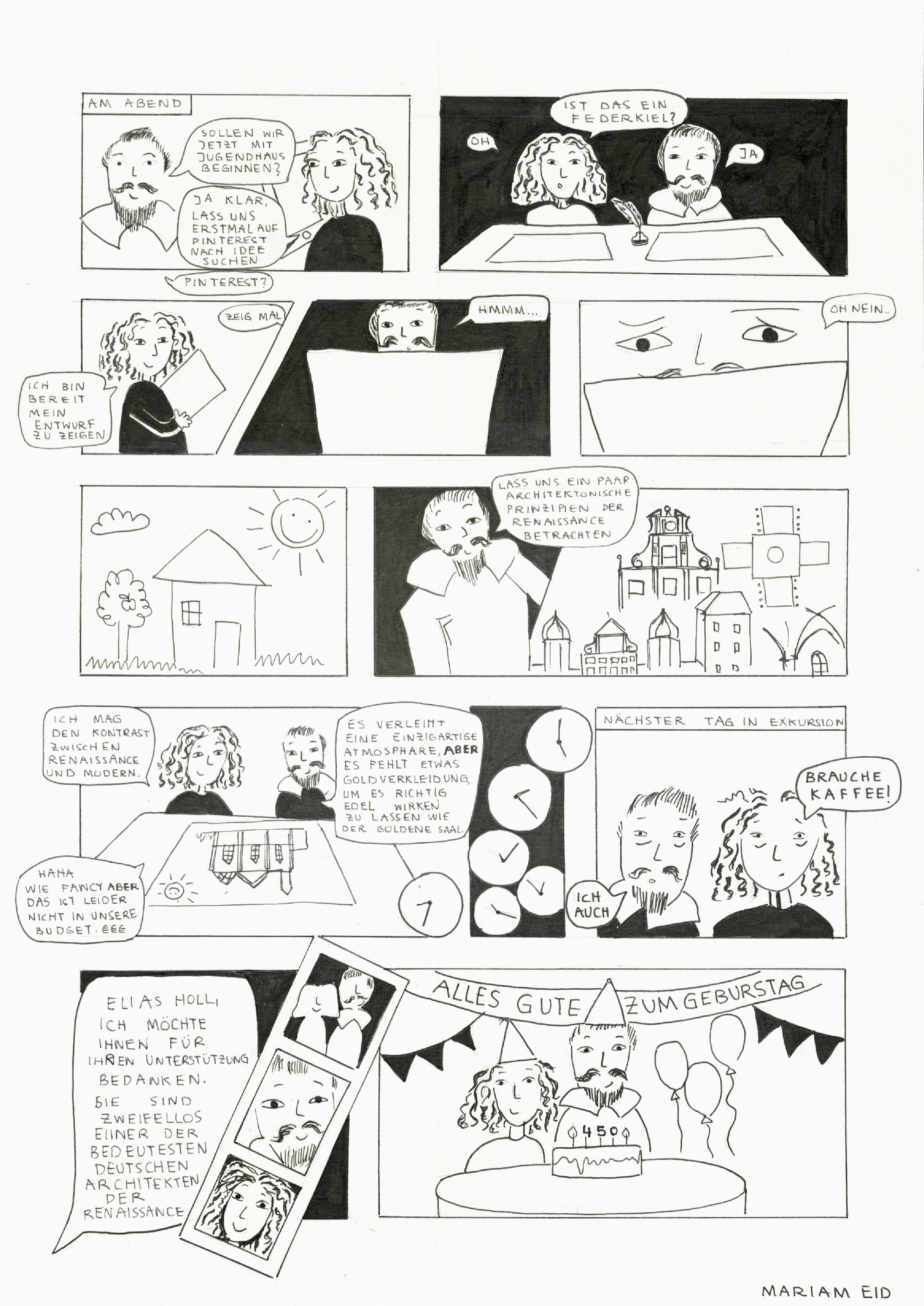 Ganz konkret sollten die Studierenden eine Dialogsituation zwischen ihnen und Elias Holl im Stil eines Graphic Novel, also eines ästhetischen Comics, darstellen. In den letzten Jahren ist das Medium des Graphic Novel immer anerkannter geworden, auch Weltliteratur wurde in die Bildergeschichten übersetzt, wie auch viele Architekt:innenmonographien.