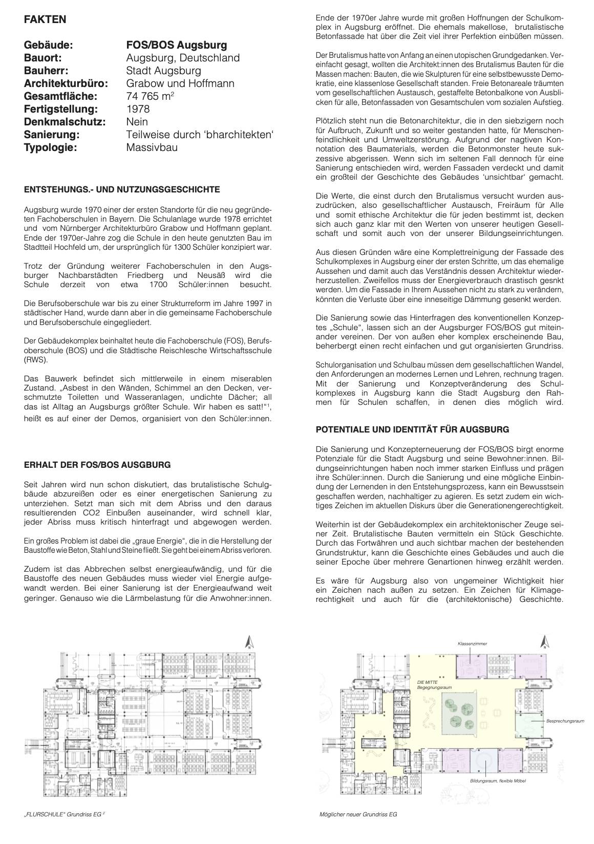 Ich habe mich mit der FOS/BOS Augsburg befasst. Hierbei habe ich anfangs über mögliche Sanierungsarbeiten nachgedacht, diese Herangehensweise jedoch letztlich verworfen. Die Arbeit beschäftigt sich nun intensiv mit dem Konzept Schule im Allgemeinen und wie Architektur dazu beitragen kann, Bildungseinrichtungen attraktiver und der Zeit angemessener zu gestalten. Diese Überlegungen habe ich im konzeptionellen Teil auf die FOS/BOS angewendet.