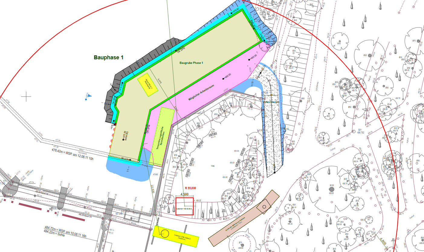 Aufgrund der großen Aushubtiefe wurde eine aussteifende Ebene aus Steifen und Rückverankerungen geplant. Diese Kombination reduziert die Belastung auf die Verbauwände, ermöglicht kleinere Spundwandprofile und minimiert Verformungen des Systems.