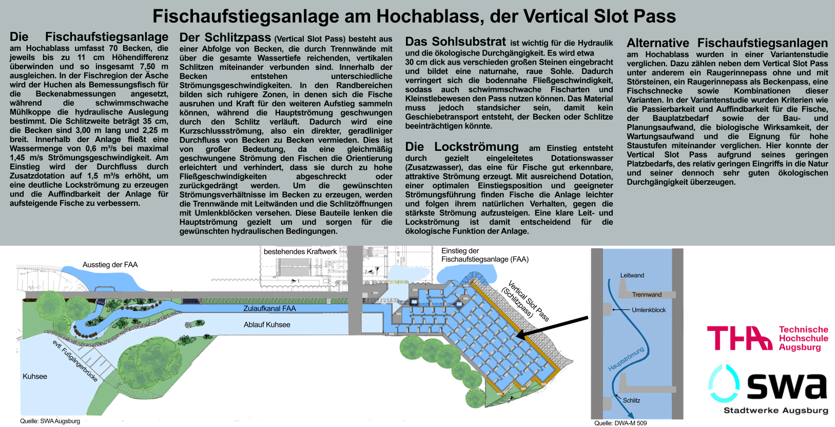 Der Hochablass mit benachbartem Kuhsee und der Kanustrecke ist in Augsburg weithin bekannt. Für das unter der Wasseroberfläche befindliche Wasserkraftwerk wird im kommenden Jahr eine Fischaufstiegsanlage gebaut. Diese umgangssprachlich auch oft als Fischtreppe bezeichnete Anlage dient der Herstellung der ökologischen Durchgängigkeit. Die ökologische Durchgängigkeit ist für die Etablierung eines gesunden Fischbestandes wichtig und ermöglicht nicht nur Fischen, sondern auch aquatischen Kleinstlebewesen Wanderbewegungen im Fließgewässer. Diese dienen den Fischen als Nahrungsgrundlage und spielen daher ebenfalls eine wichtige Rolle. Die ökologische Durchgängigkeit wird auch durch die Europäische Wasserrahmenrichtlinie EU-WRRL gefordert und wurde bereits an vielen Wehranlagen entlang des Lechs umgesetzt.