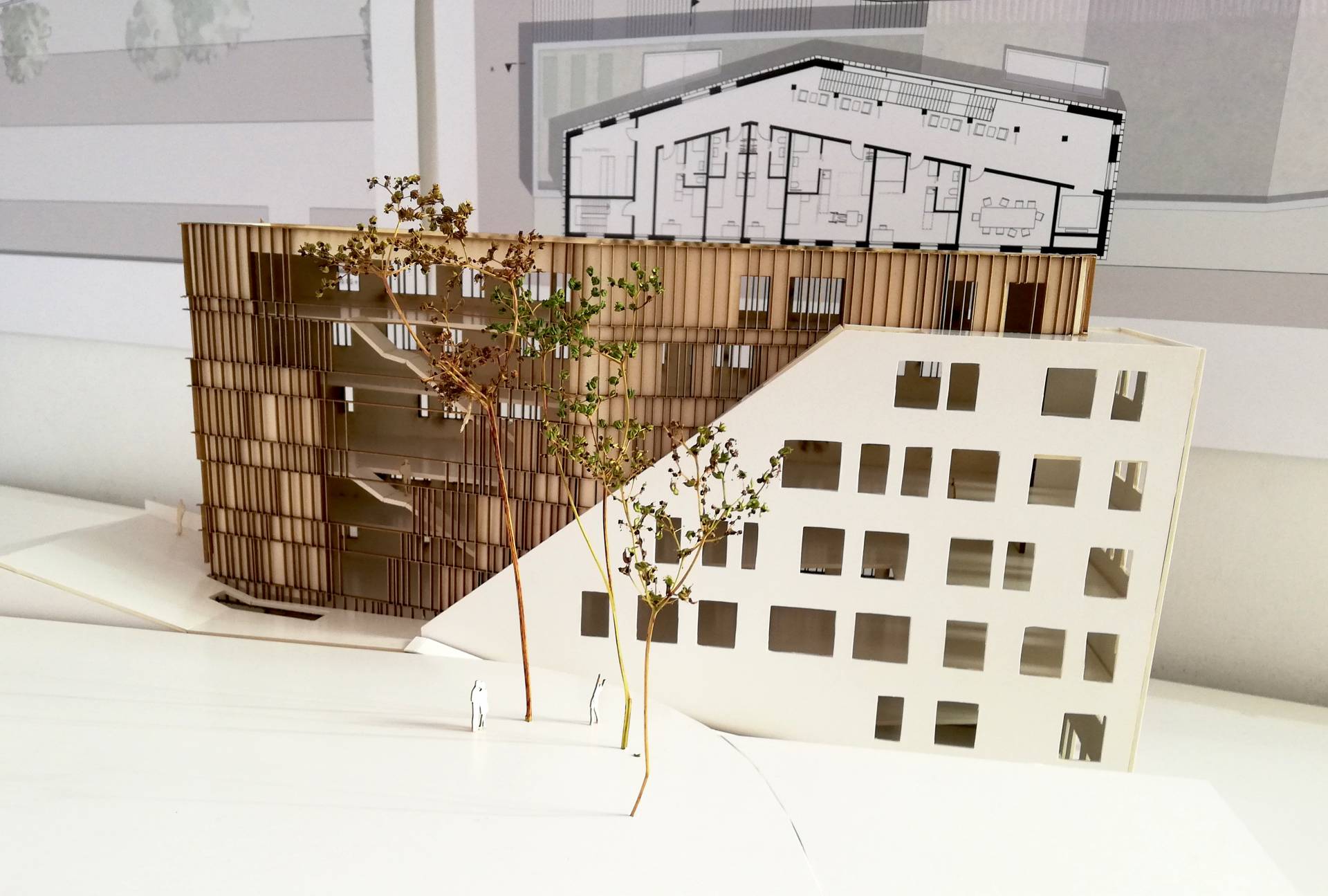 Zur Ostseite öffnet sich das Gebäude. Auf der Bohrpfahlwand entsteht durch die geschützte Lageein neuer Bereich mit hoher Aufenthaltsqualität. Wer sich über das begrünte Dach der Holzwerkstatt oder Steintreppe vom Platz aus auf die Höhe der Bohrpfahlwand begibt, tritt in Kontakt mit dem Geschehen im Inneren des Gebäudes.