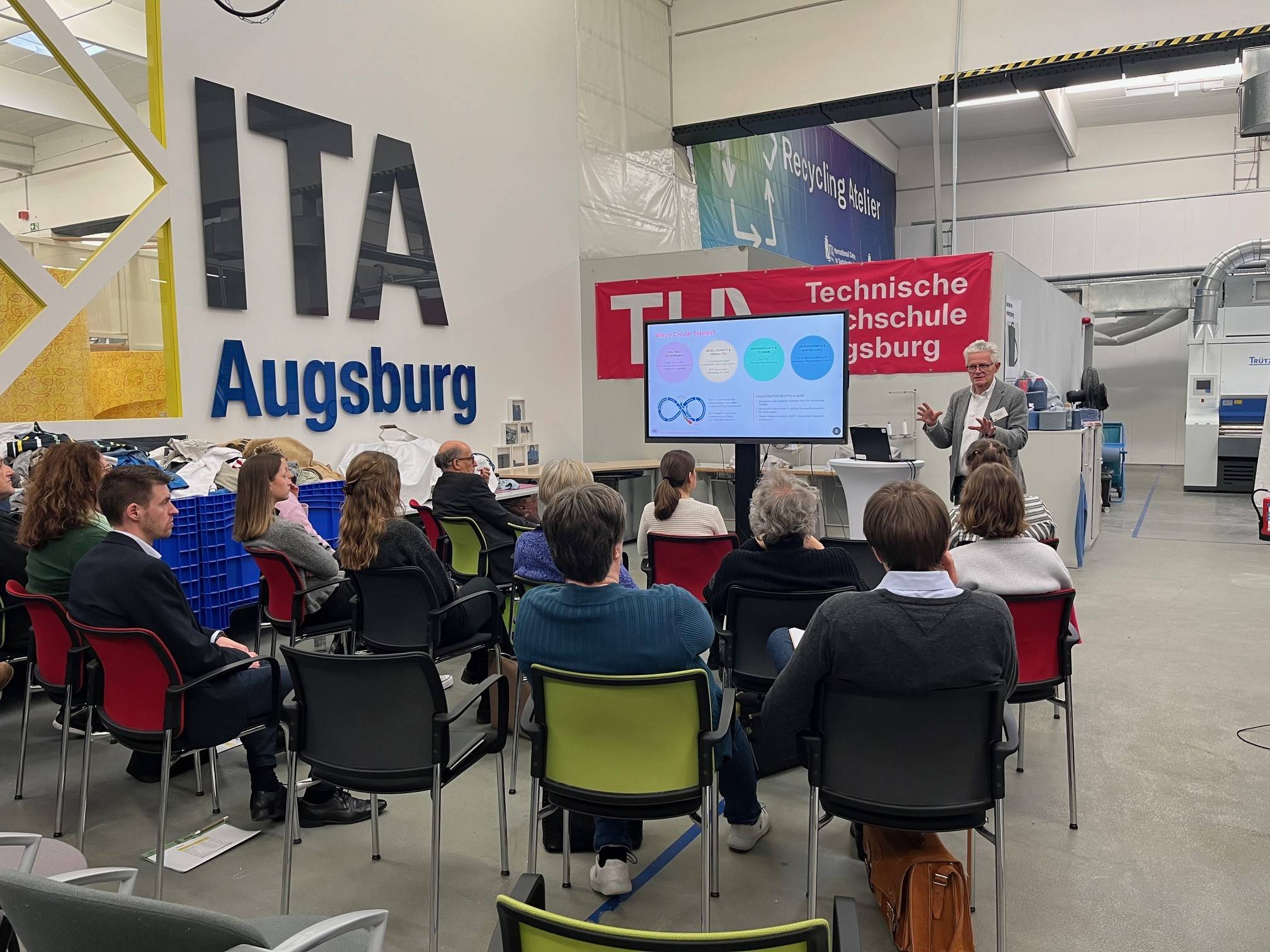 Im Austausch mit Vertreterinnen und Vertretern der Stadt Augsburg, den Abfallberatungen der Landkreise Augsburg und Aichach-Friedberg, dem Dachverband FairWertung, den Sammel- und Sortierunternehmen Aktion Hoffnung und TEXAID, der Technischen Hochschule Augsburg sowie dem Team des Recycling Ateliers wurden aktuelle Herausforderungen und Chancen der textilen Sammlung intensiv diskutiert.