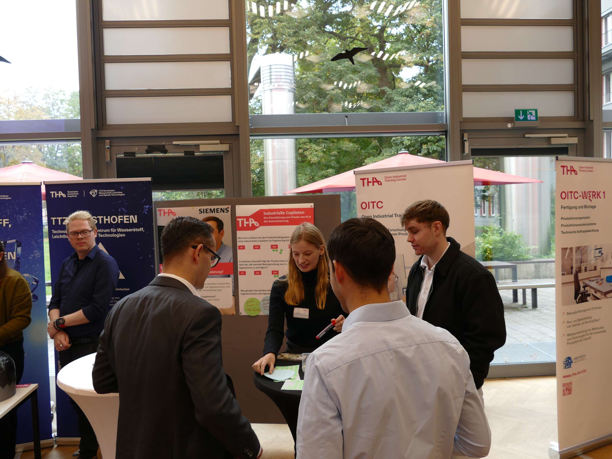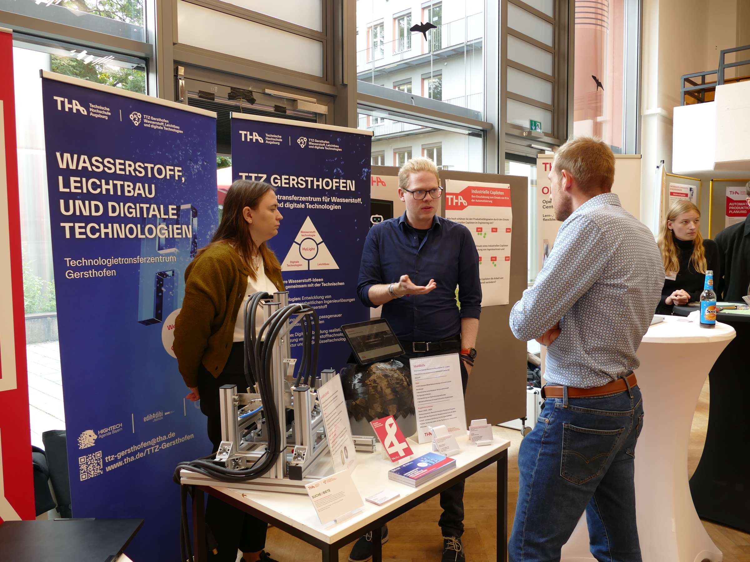 Den Tag der digitalisierten Produktion konnten die Teilnehmenden selbst mitgestalten und ihre Fragestellungen einbringen, um gemeinsam mit den Forschenden Lösungsmöglichkeiten zu erarbeiten. Ziel dabei war, dass Unternehmen konkrete Ideen für die Umsetzung in ihren Betrieb mitnehmen konnten. Begleitet wurde das Vortragsprogramm mit Informationsständen, Workshops und Austauschangeboten, die Arbeit und Angebote des Open Industrial Training Centers, des KI-Produktionsnetzwerks Augsburgs der THA und der Technologietransferzentren (TTZ) der THA in Bayerisch-Schwaben vorstellten. Die THA verfügt aktuell über fünf TTZ mit unterschiedlichen fachlichen Schwerpunkten an den Standorten Nördlingen, Donauwörth, Landsberg am Lech, Aichach und Friedberg. Hier können interessierte Unternehmen gemeinsam mit den Forschenden der THA innovative Lösungen für ihre Unternehmensbedarfe entwickeln.