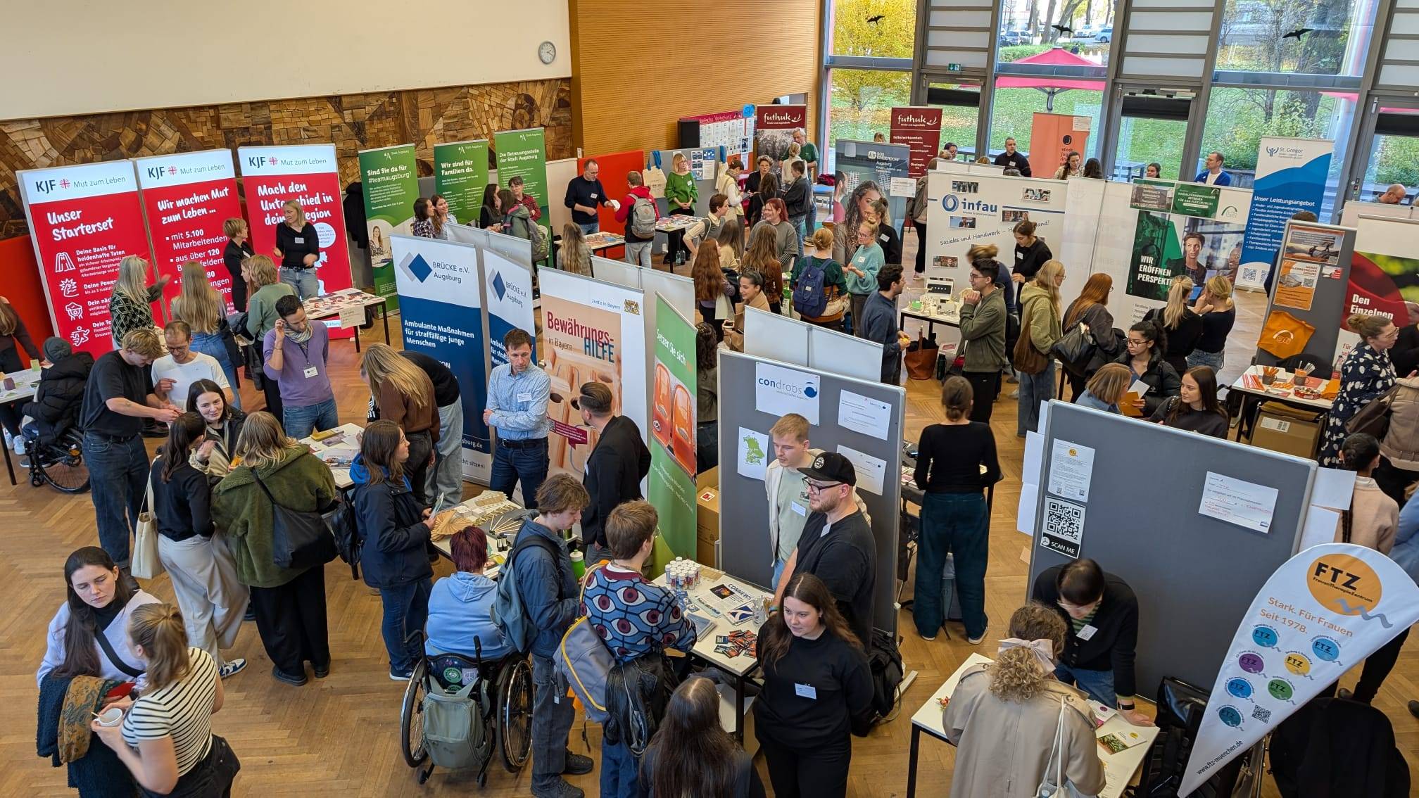 Ein besonderes Highlight war der ausgebaute „Service-Bereich“. So informierten der Career Service, das Studierendenwerk und der Hochschulberater der TK zu den Beratungs- und Unterstützungsmöglichkeiten rund um Bewerbung, Finanzierung des Studiums und Krankenversicherung. Zudem waren erstmalig die Hochschulgruppen der GEW-Gewerkschaft und des Jungen DBSH vertreten und thematisierten an ihren Ständen die gewerkschaftliche Organisation und Vertretung des Berufsstandes. Besonders die Initiative zur Vergütung des Praxissemesters des Jungen DBSH führte zu angeregten Gesprächen und zeigte die hohe Relevanz des Themas für die Studierenden.
