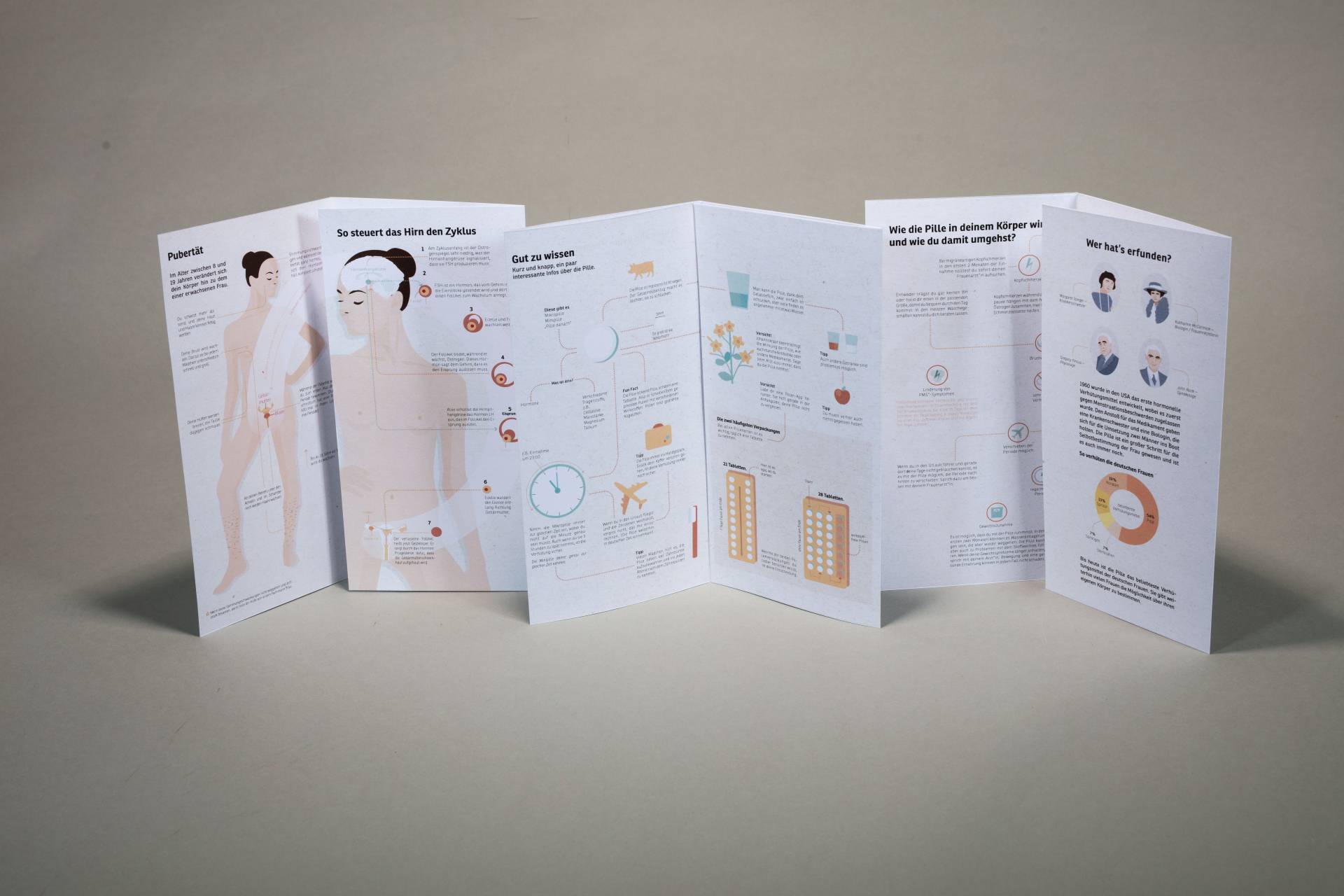 Im Rahmen ihrer Bachelorarbeit bei Prof. Michael Stoll hat sich Veronika Graf im Wintersemester 2018/2019 mit der „Pille“ auseinandergesetzt und damit, was junge Mädchen, die zum ersten Mal mit der Pille verhüten, wissen sollten. Ihre Erkenntnisse hat Graf infografisch in einem Flyersystem im kompakten Format zusammengefasst. In den drei Flyern erklärt sie im grafisch-iIllustrativen Stil, was während der Pubertät mit dem Zyklus passiert, wie die verschiedenen Pillen und die darin enthaltenen Hormone diesen Zyklus beeinflussen, und wie die Pille im Körper wirkt. Gespickt sind diese Erklärungen mit Tipps und geschichtlichem Hintergrundwissen.