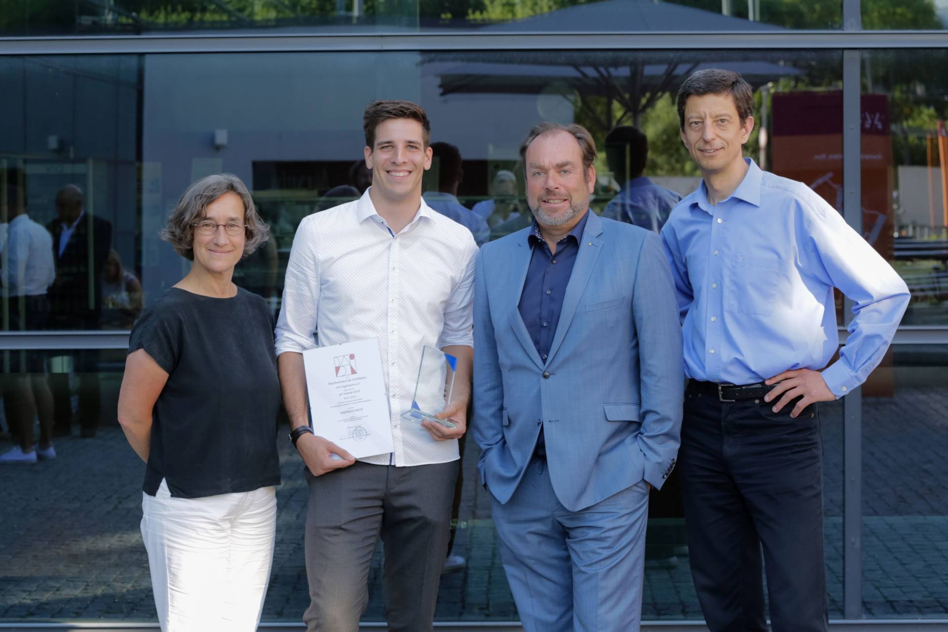 Als erster Vorsitzender des Bund der Architekten und Ingenieure (BAI) e.V. übergab Dipl.-Ing. (FH) Ulrich Zuth den BAI-Preis 2018 an Andreas Mack. Im Studiengang Energie Effizienz Design − E2D stach seine Masterarbeit mit dem Titel: „Dach als Fassade − Parametrische Integration passiver Systeme zur Gebäudeklimatisierung in Dachstrukturen.“ besonders hervor. Die Arbeit war unter Betreuung von Prof. Dipl.-Ing. Georg Sahner und Prof. Dr.-Ing. Christian Bauriedel entstanden.