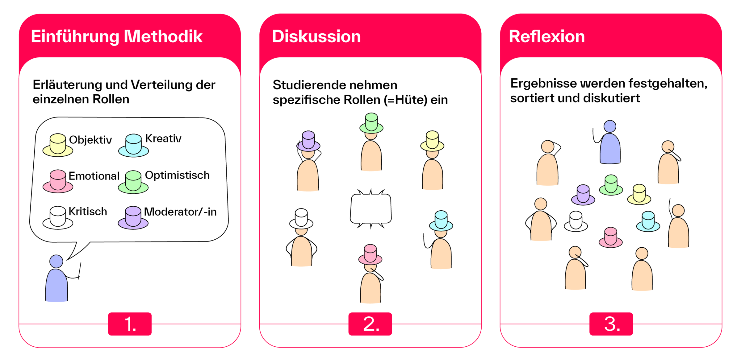 1. Zu Beginn führen Sie die Studierenden in die Methodik ein. Entscheidend ist dabei, dass alle Teilnehmenden die einzelnen Rollenbilder (s. Abbildung) verstanden haben. Mithilfe von verschiedenfarbiger Karten, Hüte, etc. können dann die sechs unterschiedlichen Rollen dargestellt und an die Studierenden verteilt werden.