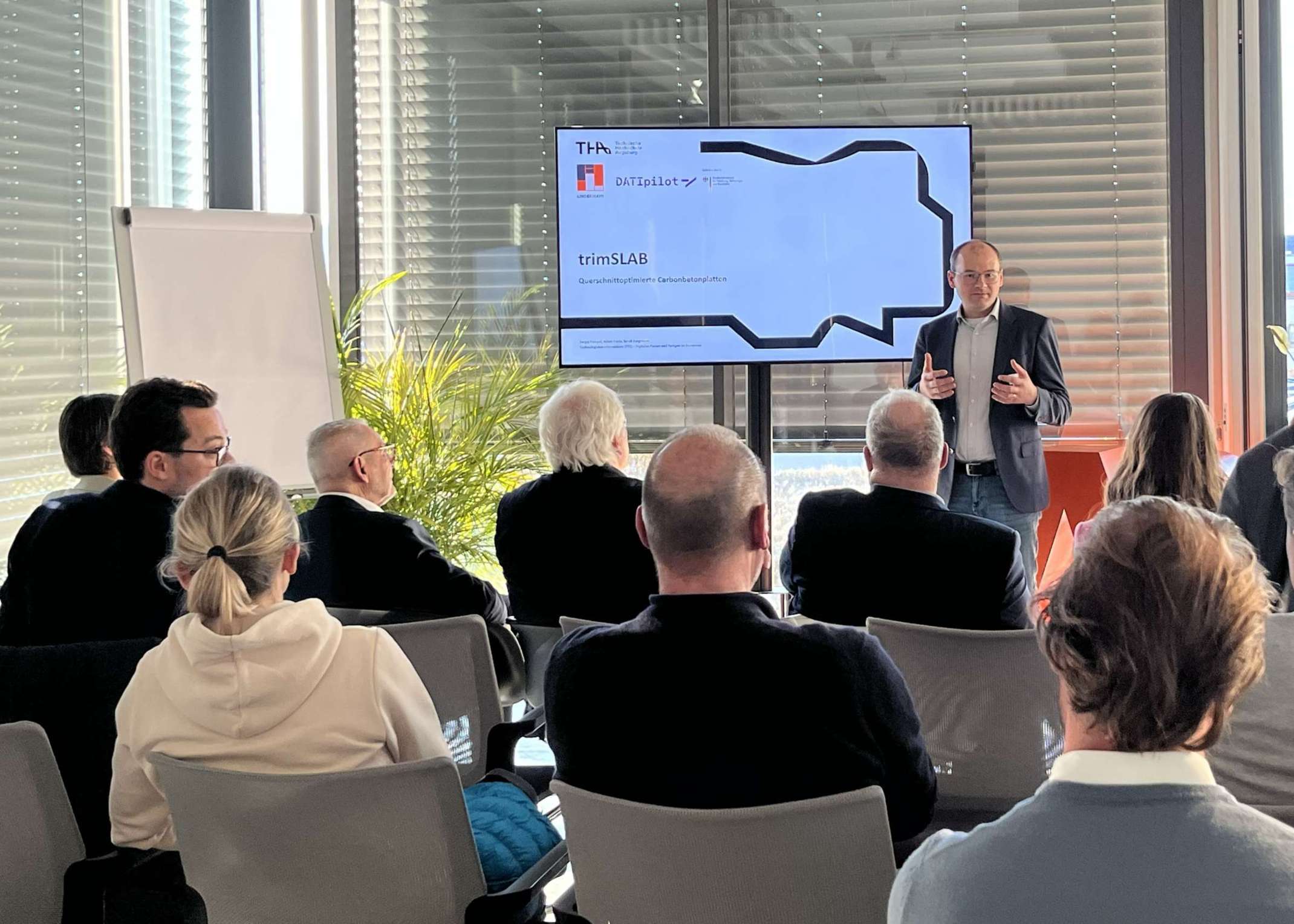 Unter den Speakern waren Prof. Dr.-Ing. Sergej Rempel, wissenschaftlicher Leiter im Forschungsfeld Massivbau am Technologietransferzentrum (TTZ) Digitales Planen und Fertigen im Bauwesen der Technischen Hochschule Augsburg in Aichach sowie Julian Frede, Promovend am TTZ Aichach. Unter dem Vortragstitel „Halb so viel Beton, volle Leistung” stellten sie die Konzeption eines innovativen Deckensystems vor, das sie in Kooperation mit der Lindermayr GmbH & Co.KG aktuell im Rahmen eines DATIpilot Innovationssprints im Forschungsprojekt trimSLAB entwickeln.