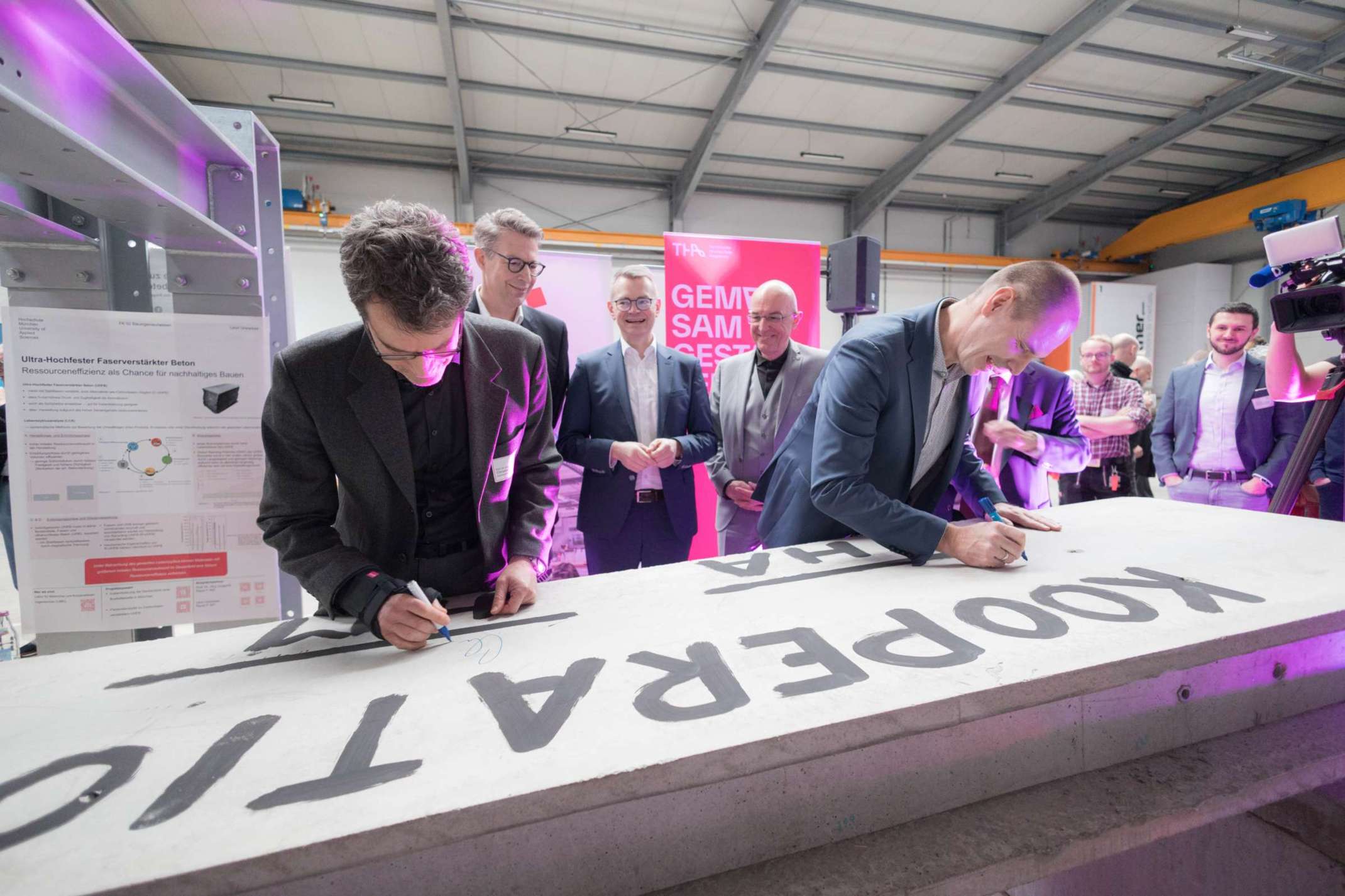 Im Beisein von Bayerns Wissenschaftsminister Markus Blume, MdL unterzeichneten die Vertreter beider Hochschulen symbolisch auf einer eigens entwickelten Carbon-Betonplatte die Kooperationsvereinbarung. Um den Ressourcenverbrauch in Gebäuden zu reduzieren, forscht die THA gemeinsam mit den Firmen LINDERMAYR GmbH & Co. KG und Hitexbau GmbH an querschnittsoptimierten Deckenplatten, die in dieser Form nur mit Carbon-Bewehrung realisiert werden können.