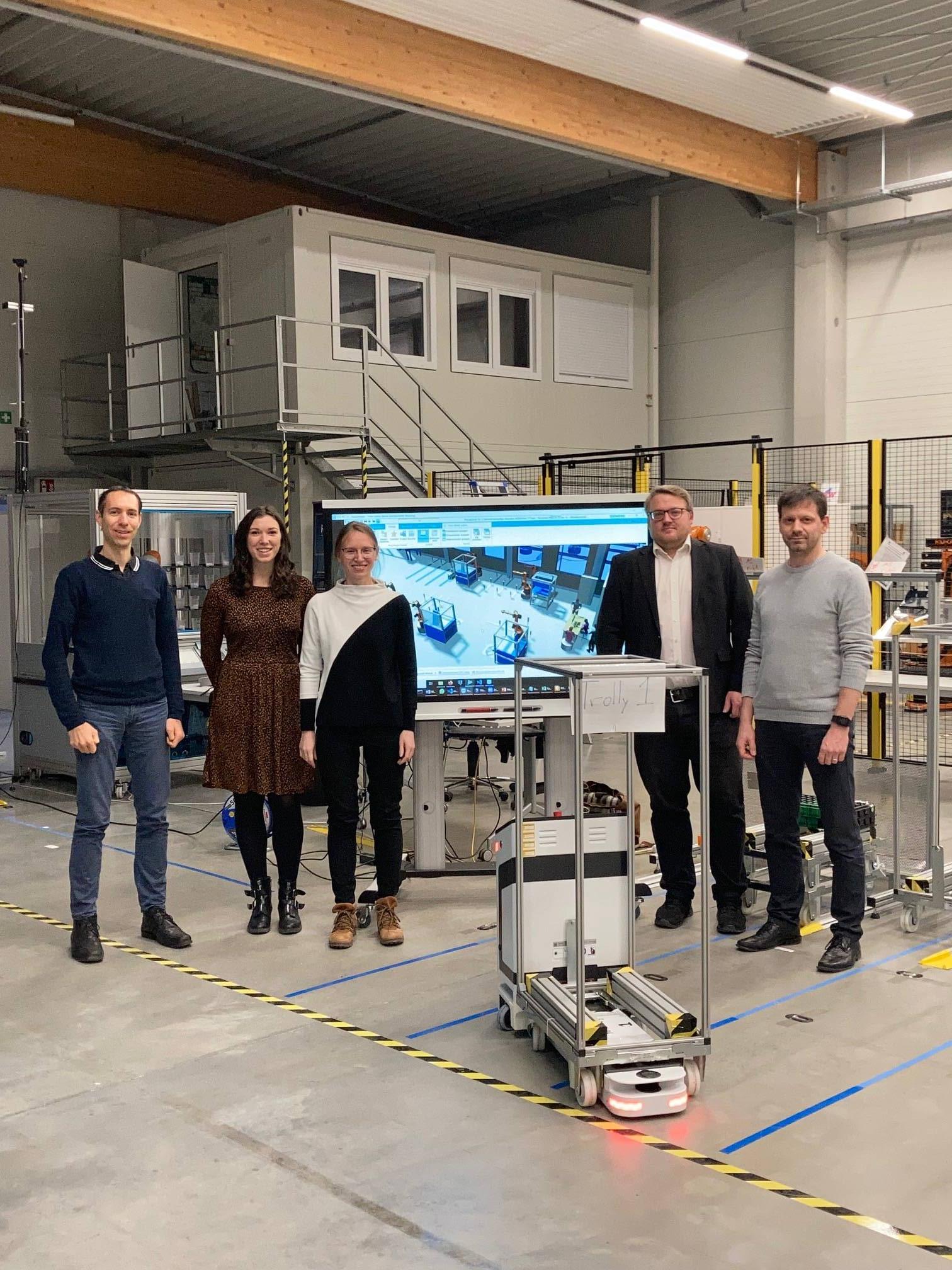 Die Hochschule Augsburg entwickelte am TTZ Flexible Automation Nördlingen die technische Umsetzung des Materialflusskonzeptes. Dazu wurde eine Materialflusssteuerungssoftware konzipiert und mittels Simulationsmodellen validiert. Nach erfolgreichen virtuellen Tests beauftragt die Software jetzt ebenfalls fahrerlose Transportfahrzeuge, wie anhand eines Demonstrators am TTZ Nördlingen gezeigt wurde.