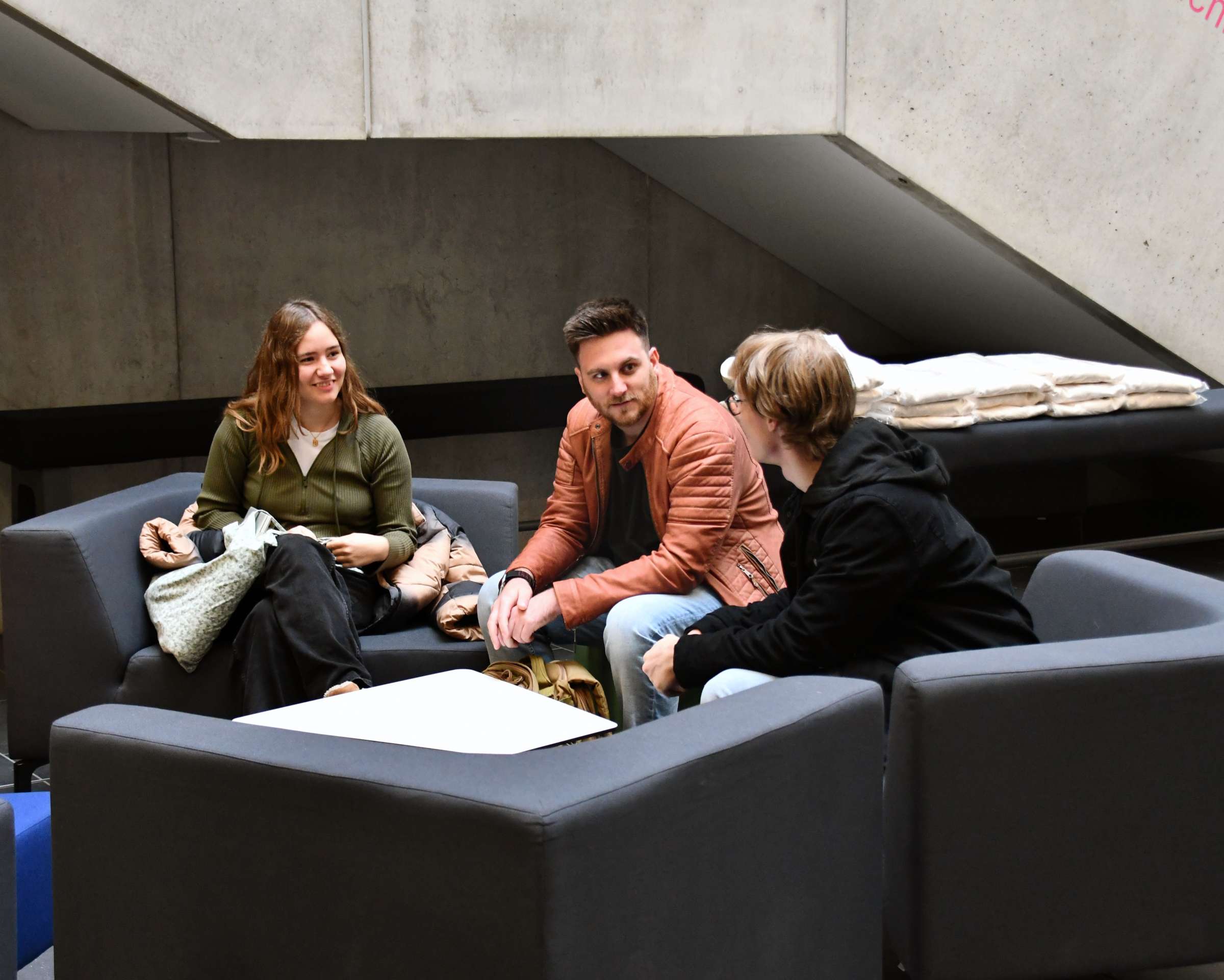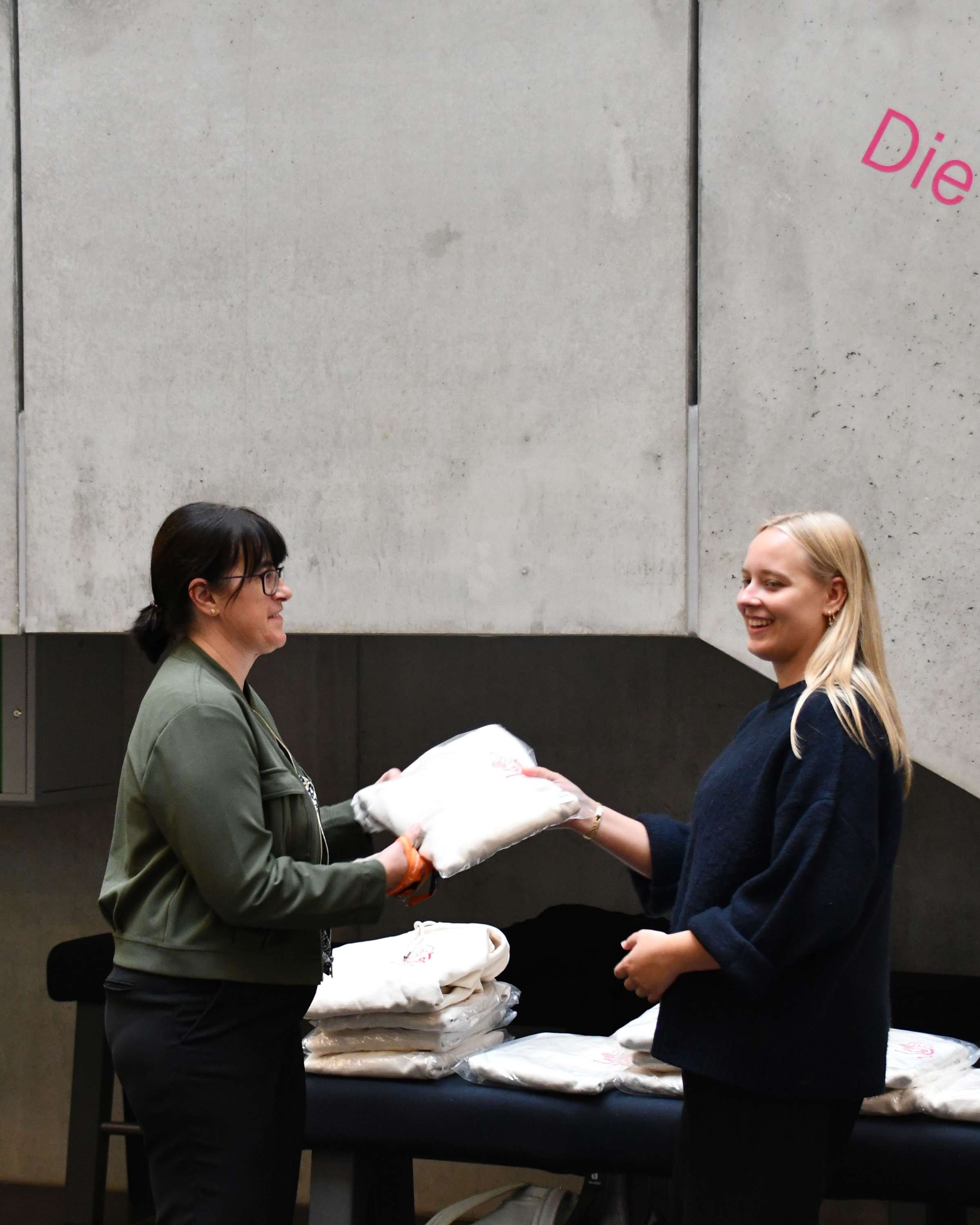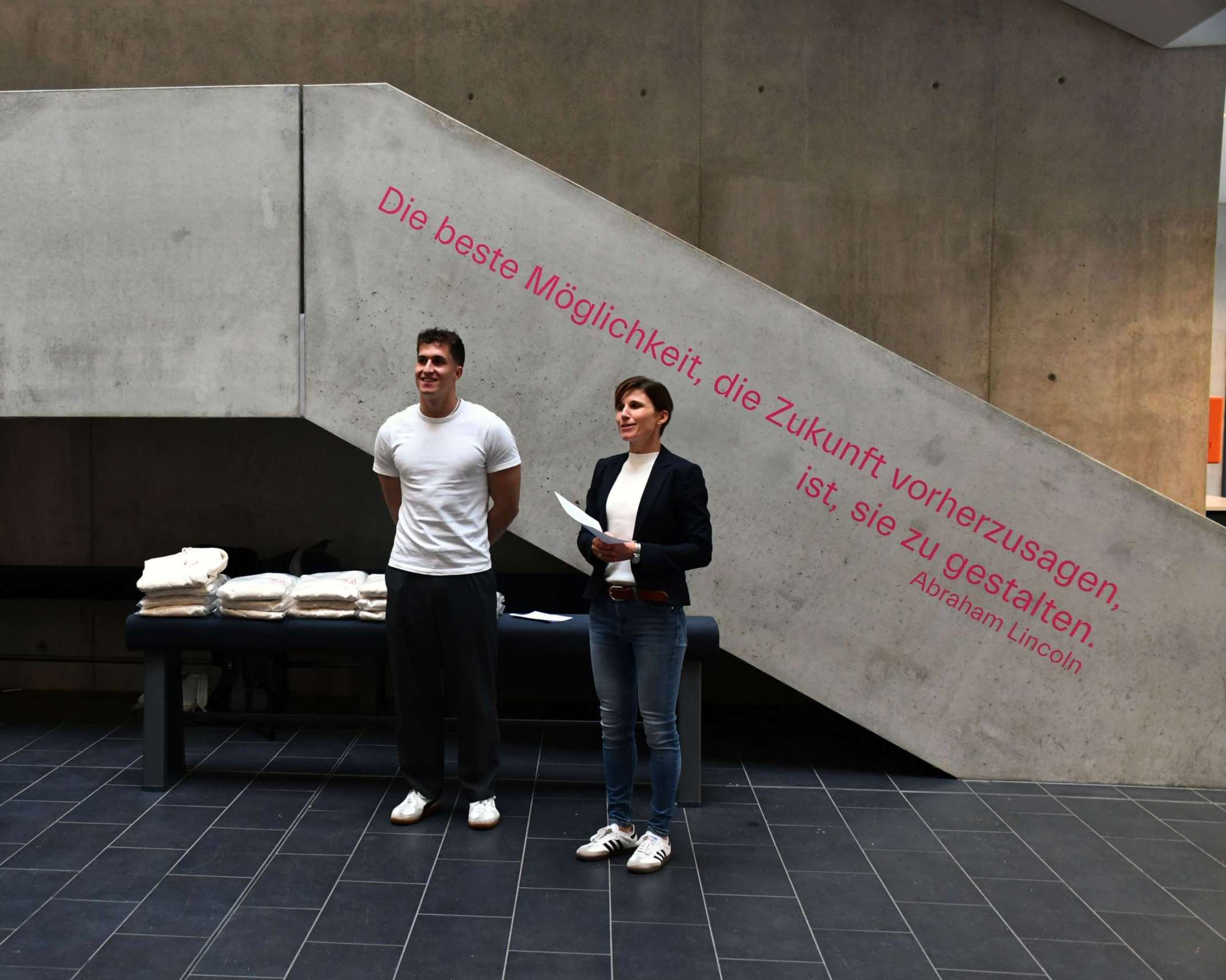 Als Dankeschön erhielten alle Teilnehmenden, deren Zitate ausgewählt wurden, ein Geschenk – den THA-Hoodie – und gemeinsam wurde auf den neuen Look des Foyers angestoßen. Schnell zeigte sich: Die Zitate regen zum Austausch an. Über Bedeutungen wird diskutiert, Aussagen werden interpretiert und hinterfragt. Damit ist ein zentrales Ziel des Projekts erreicht: Wir bleiben im Gespräch, fragen nach dem „Warum“ und bleiben offen für Neues.