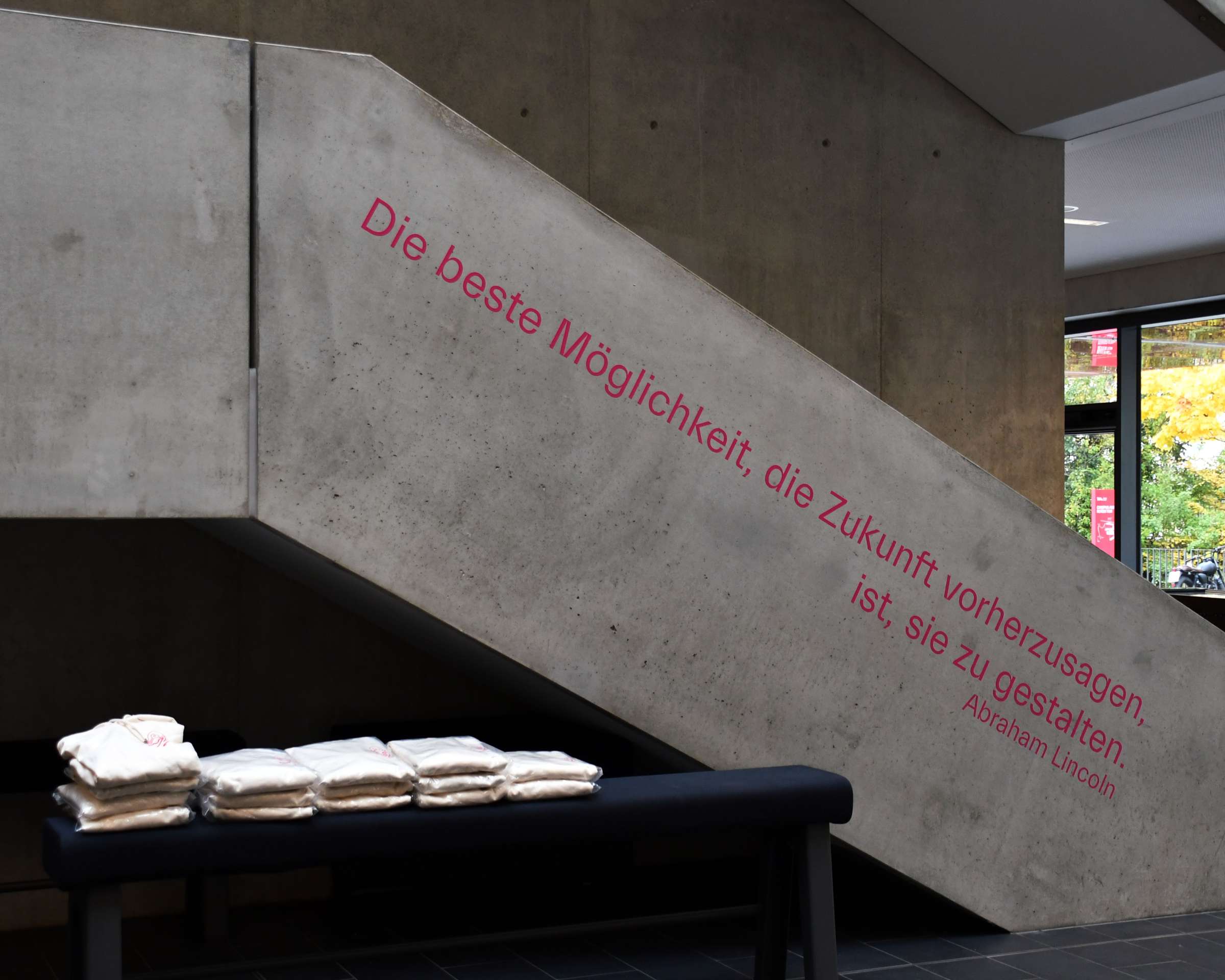Auch gestalterisch wurde das Foyer neu gedacht: Die Zitate wurden so positioniert, dass sie aus allen Blickrichtungen sichtbar sind – beim Betreten des Gebäudes, auf dem Weg in die Hörsäle oder in den Pausen. So wird das Foyer zu einem Ort des Zusammenkommens, der Inspiration und der Persönlichkeitsentwicklung – ein Raum, der zum Nachdenken anregt und Gespräche anstößt.