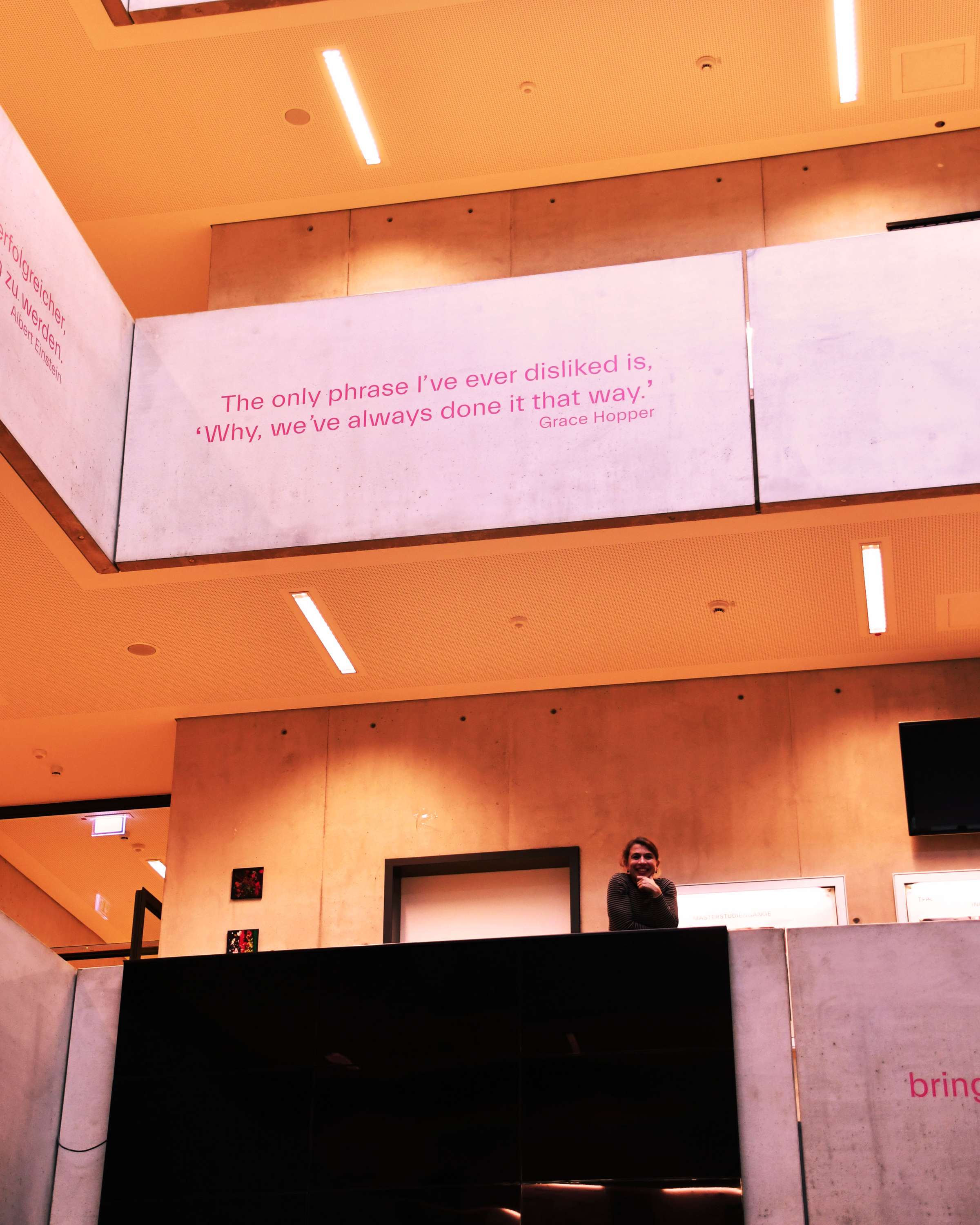 Mit den Zitaten von Grace Hopper und Irène Joliot-Curie wurde auch der Frauenanteil sichtbar gestärkt. Eingereicht wurden sie von Karen Grando, Studiengangskoordinatorin des Bachelorstudiengangs Wirtschaftspsychologie: „Weibliche Zitate zu finden, war tatsächlich nicht so einfach – schließlich waren Frauen in der Vergangenheit weniger sichtbar. Die beiden Verfasserinnen sind starke Persönlichkeiten, die sich trotz schwieriger Umstände durch ihr Wissen und ihren Mut durchgesetzt haben. Der starke Frauenanteil an unserer Fakultät zeigt, dass sich in der Gesellschaft viel verändert hat.“