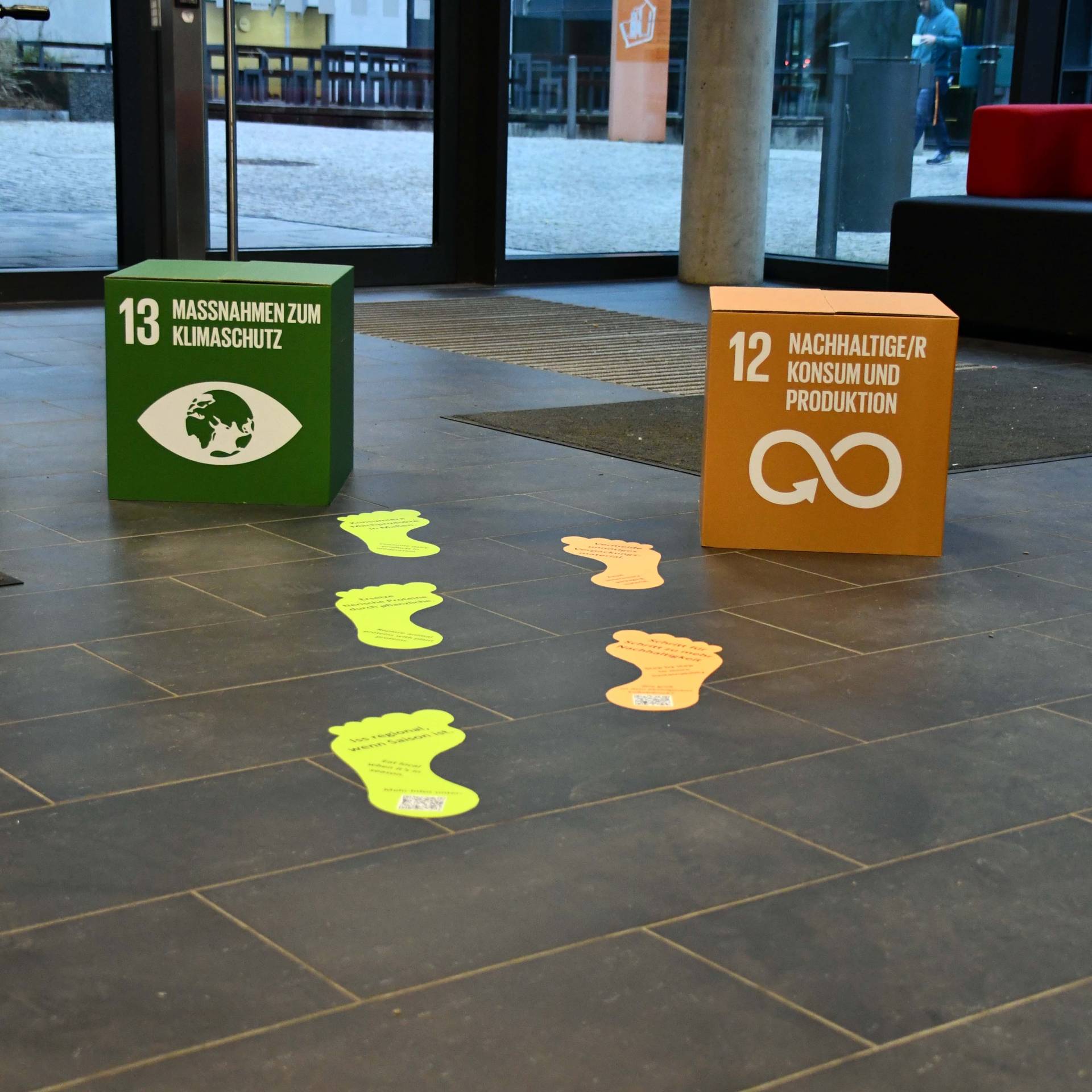 Ziel war es, ein Bewusstsein dafür zu schaffen, welche Reduzierungen des eigenen CO2-Fußabdrucks durch regionale und vegetarische bzw. vegane Ernährung möglich sind. Auch die Auswirkungen auf die Umwelt durch Produktion, Transport, Verpackung oder die Zubereitung von Lebensmitteln werden dabei berücksichtigt. Die Studierenden möchten zum Nachdenken über das eigene Ernährungsverhalten anregen und so zu den UN-Nachhaltigkeitszielen 12 (nachhaltiger Konsum und Produktion) sowie 13 (Maßnahmen zum Klimaschutz) beitragen. Um die Aufmerksamkeit auf das Thema zu lenken, hat die Projektgruppe große, bunte Fußabdrücke entwickelt, die im W-Gebäude beim Ausgang zur Mensa auf dem Boden angebracht wurden. Die Fußabdrücke enthalten Basisinformationen zur CO2-armen Ernährung sowie einen QR-Code, über die man zum CO2-Rechner für Lebensmittel und Essen gelangt sowie einer Studie, die Bilanzen für über 200 Lebensmittel ermittelt hat.
