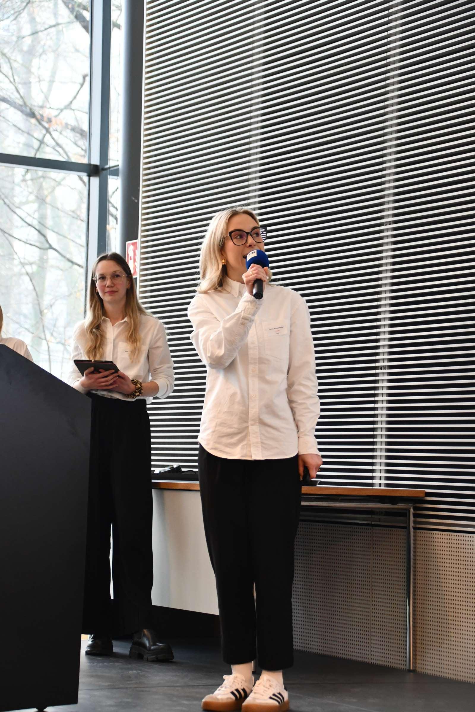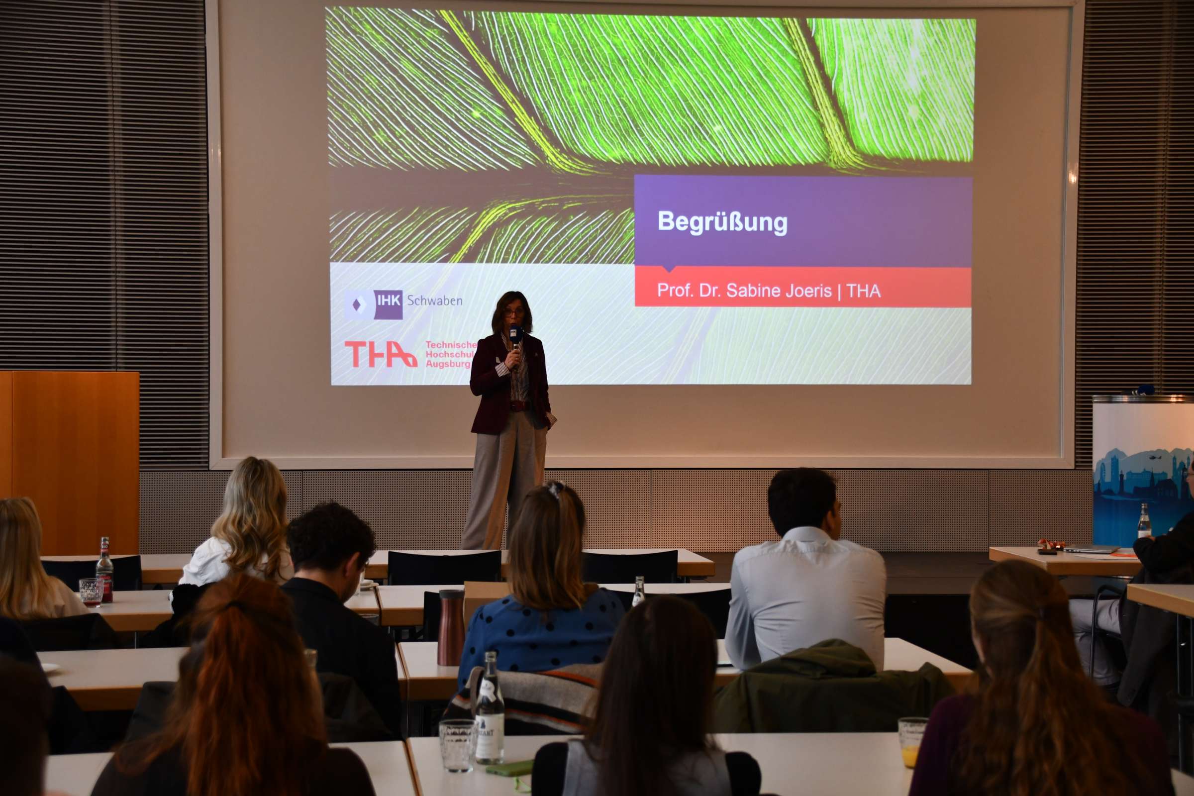 Eröffnet wurde die Veranstaltung von Melanie Hornikel von der IHK Schwaben, die die Bedeutung von Nachhaltigkeit in einer Zeit betonte, in der die Einhaltung der Klimaziele zunehmend unter Druck gerät. Laut Prof. Dr. Sabine Joeris, Studiengangsleiterin des Masterstudiengangs und Projektbetreuerin, zeigten die Ergebnisse des Nachhaltigkeitsmonitorings 2024 und 2025 deutlich, dass der Erfahrungsaustausch zwischen Unternehmen ein zentraler Treiber für die erfolgreiche Umsetzung von Nachhaltigkeitsmaßnahmen ist. Mit der Abschlussveranstaltung wurde hierfür ein passender Rahmen geschaffen.