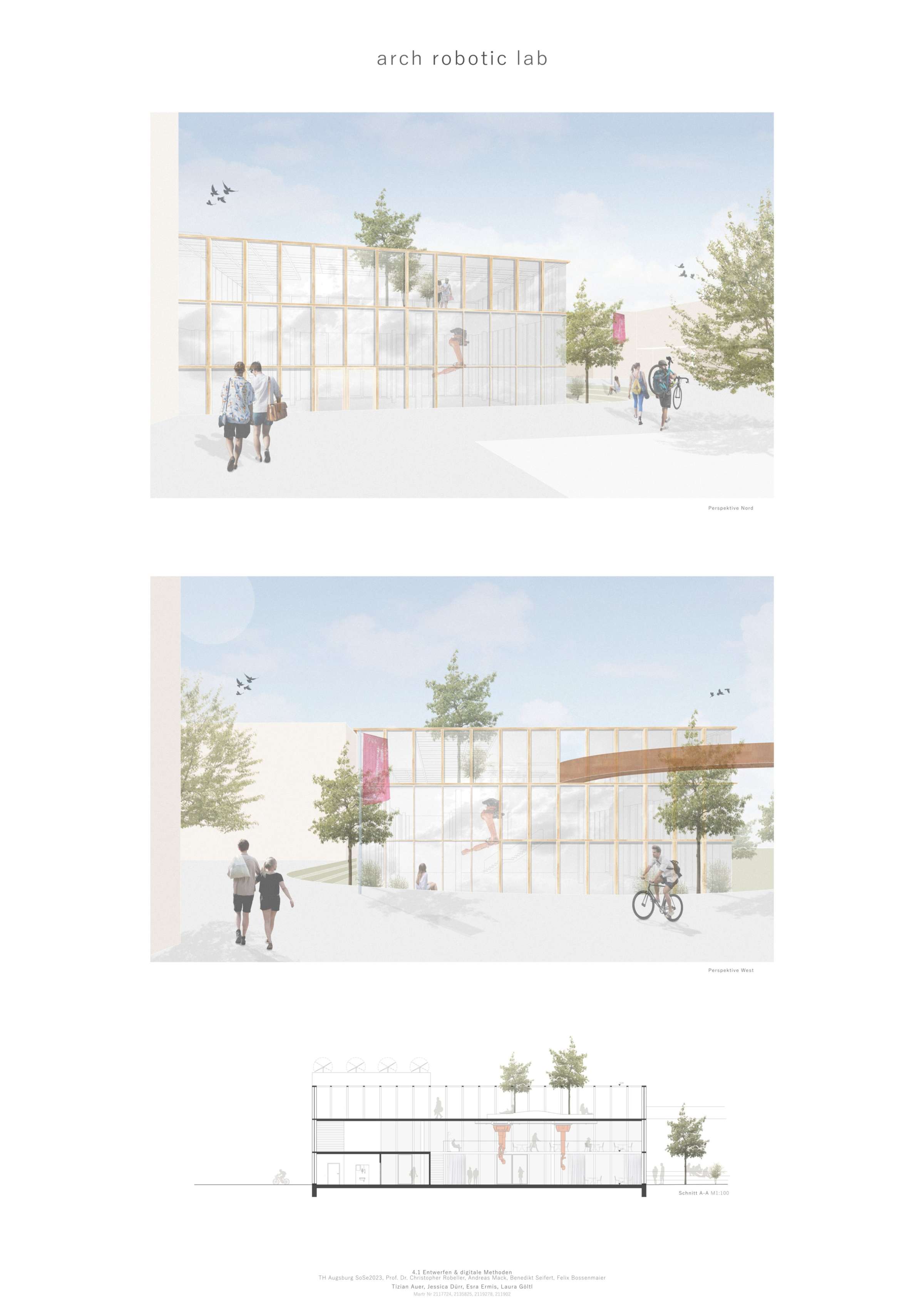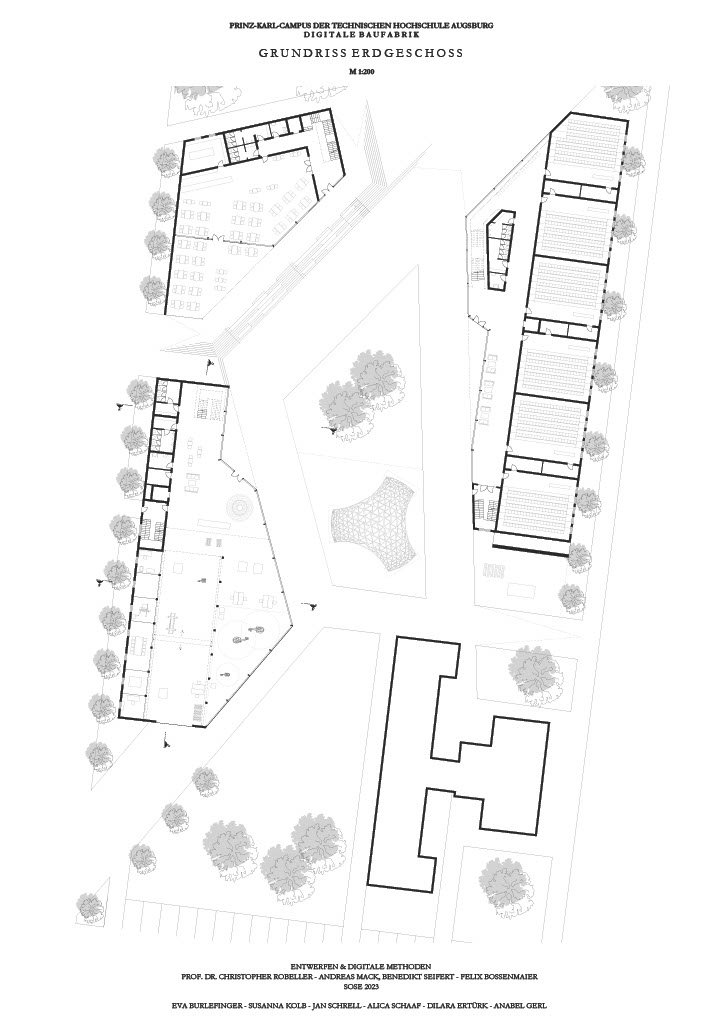 Im Anschluss an die Konzepterstellung widmeten sich die Teams jeweils einem Gebäude, das als wegweisende digitale Baufabrik dienen und spannende Experimente ermöglichen soll. Die Baufabrik fungiert in erster Linie als Labor, aber auch als Showroom und Austauschort für verschiedene Fachrichtungen, wobei der Fokus auf der digitalen Fabrikation und dem Holzbau liegt.