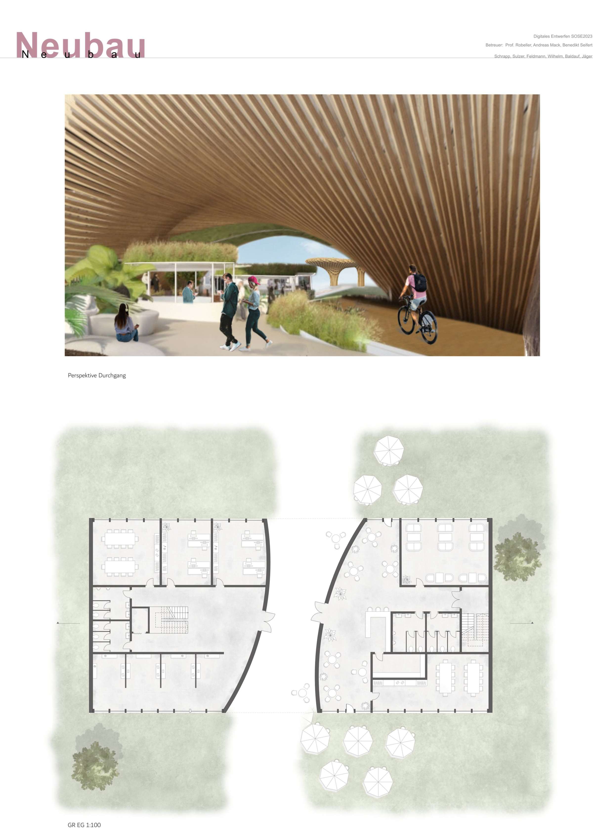 Das erlernte Wissen konnten die Studierenden direkt in ihre Entwurfsprozesse einsetzen und vertiefen. Jede Gruppe sollte ebenfalls ein Forschungsprojekt recherchieren und in ihren Entwurf integrieren.