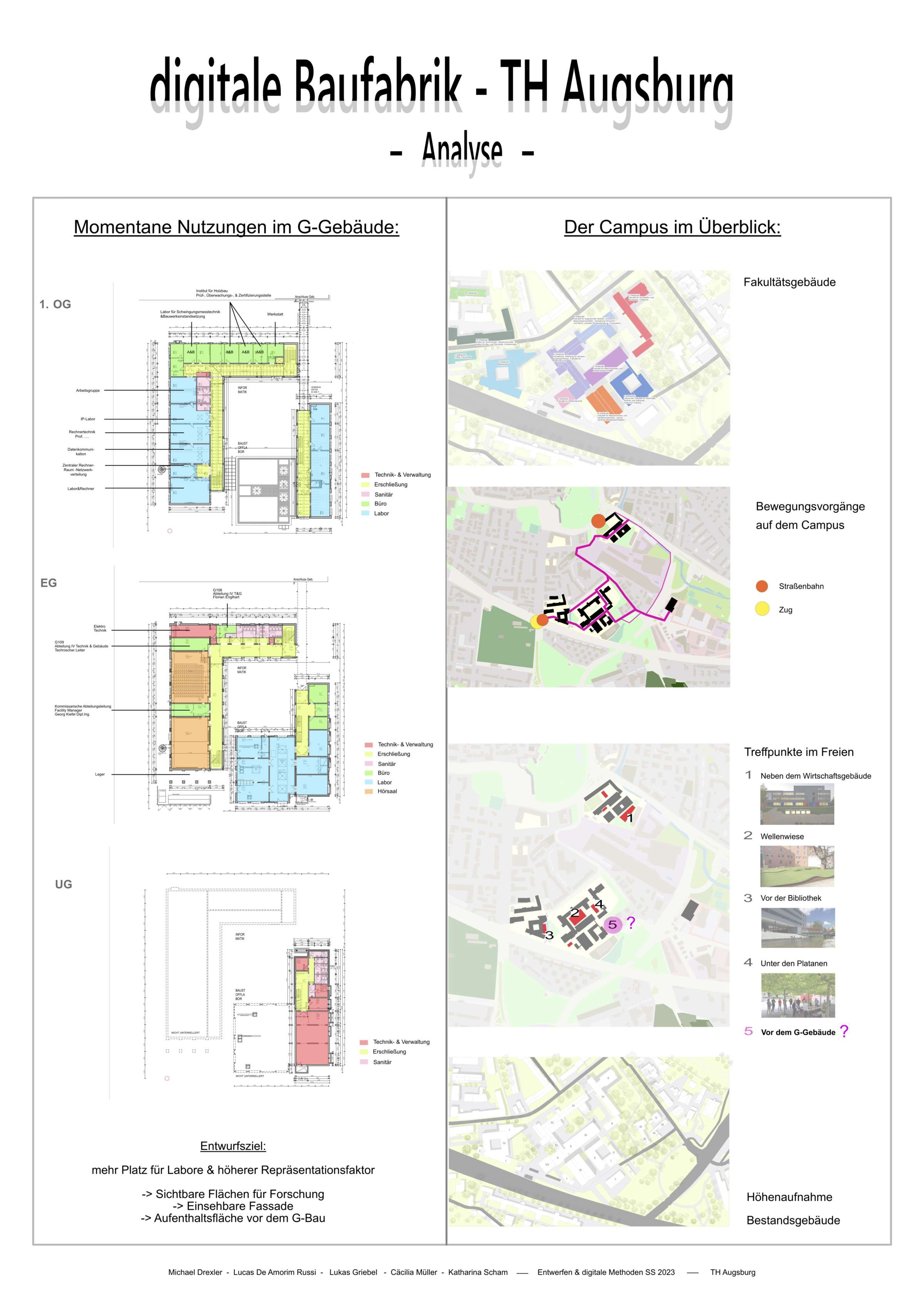 Der Höhepunkt des Semesters war die Präsentation der Ergebnisse in den Fluren des C-Baus. Hier stellten die Gruppen ihre spannenden Entwürfe in Form von Grundrissen, Schnitten und Ansichten vor, aber zeigten auch Visualisierungen, Modelle und sogar eine Animation für eine mögliche Weiterentwicklung des Campus und eine mögliche innovative neue digitale Baufabrik.