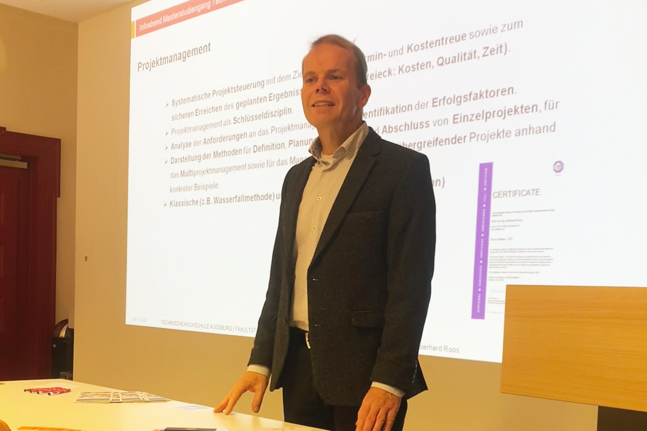Zum Auftakt begrüßte Dekan Prof. Dr.-Ing. Ulrich Weigand die Studieninteressierten. Prof. Dr.-Ing. Eberhard Roos erläuterte, daran anschließend, den Ablauf und die Inhalte des berufsbegleitenden Masters. Ergänzt wurden seine Ausführungen durch Prof. Dr. Alexandra Coenenberg im Bereich Wirtschaftswissenschaften und Prof. Dr. rer. nat. Helia Hollmann im Bereich Industrial Safety and Security, einem neuen Schwerpunkt im Master Technologie-Management.