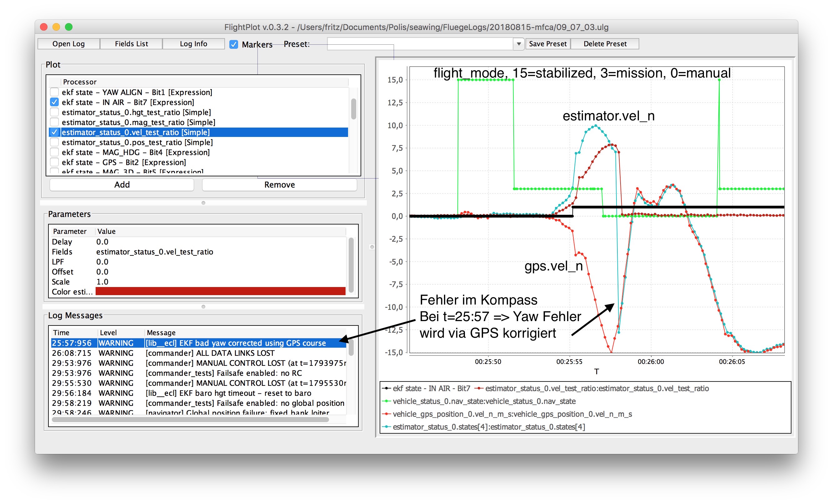 In Abbildung 1 kann man die Unterschiede zwischen der Geschwindigkeitsschätzung des Kalmanfilters und des GPS sehen. “estimator.vel_n” gibt die Geschwindigkeitsschätzung des Kalmanfilters in Nordrichtung an. “gps.vel_n” gibt die Geschwindigkeitsschätzung in Nordrichtung des GPS an. Man sieht große Abweichungen, die zum Zeitpunkt t=25:57 verschwinden. Im Log ist zu lesen “EKF bad yaw corrected using GPS Course”. Die Abweichungen drücken sich auch durch den Parameter “vel_test_ratio” aus, der das Verhältnis zwischen Sensormessungen und Schätzung durch den Kalmanfilter ausdrücken. Dieses Verhältnis sollte im normalen guten Flug einen Wert unter 0.5 haben. Hier steigt der Wert auf 7.5.
