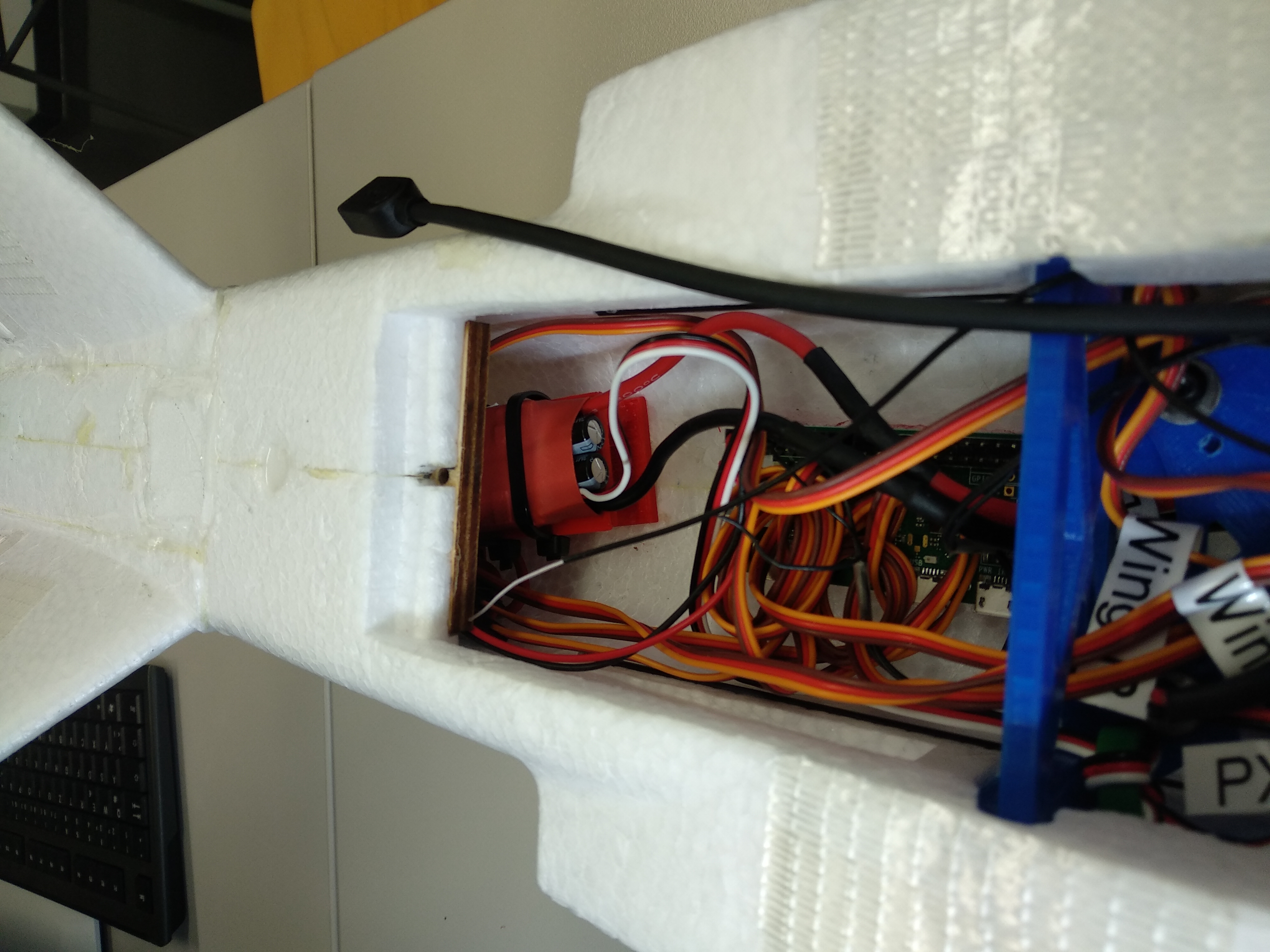 - Pixracer auf Grundplatte aufbringen (3M Foam Dampermat) (auf Abstand zu Montagelöchern der Grundplatte achten!) (auf Ausrichtung vorne/hinten achten! Servorail hinten)