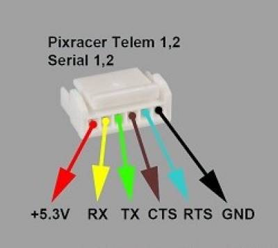 Note the difference between the yellow cable named TX on the board and RX on the connector!!! The name RX for the yellow cable on the JST-GH cable connector refers to the RX on the RFD868 modem. Please remember to connect the RFD868+ TX to the PixRacer RX and vice versa. So according to the following table: