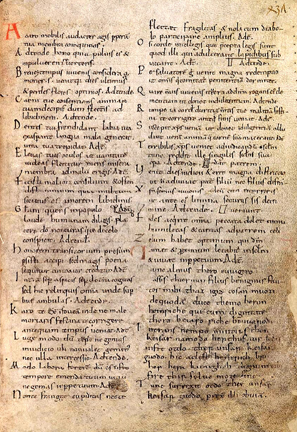flectet fragilitas, et noli cum diabolo participare amplius. Adtende homo, quia pulvis es et in pulverem reverteris. 14 O si corde intellegis, que precepta legis sunt, quod illi, qui adulterant, lapidibus subiaceant! Adtende homo, quia pulvis es et in pulverem reverteris. 15 Per salvatorem igitur venit magna redemptio, ut omnis, qui comitatur, penitentiam dormitet. Adtende homo, quia pulvis es et in pulverem reverteris. 16 Quare non vis, iuvenis, reverti ad Dominum, rogans eius clementiam, ut donet indulgentiam? Adtende homo, quia pulvis es et in pulverem reverteris. 17 Rumpe iam cordis duritiam, mentis tue malitiam, festina te corrigere, antequam finis veniat. Adtende homo, quia pulvis es et in pulverem reverteris. 18 Suscepit Christus veniam, ut donet indulgentiam, alludant veram animam, que carnem suam macerant. Adtende homo, quia pulvis es et in pulverem reverteris. 19 Terribilis Christus veniet ad iudicandum seculum; tunc reddit ille singulis secundum sua opera. Adtende homo, quia pulvis es et in pulverem reverteris. 20 Venit dies iudicii et erit magna districtio, ut non adiuvet pater filium nec filius defendat patrem. Adtende homo, quia pulvis es et in pulverem reverteris. 21 Xristo servis, iuvenis, ad eum cito recurreris, ut ante eius limina securus sis de crimine. Adtende homo, quia pulvis es et in pulverem reverteris. 22 Fides acquirit omnia, peccata delet nimia, humilitas et caritas ad patrem celi veniunt. Adtende homo, quia pulvis es et in pulverem reverteris. 23 Zelum habet optimum, qui Deum amat et proximum, letabitur in seculum et vivat in perpetuum. Adtende homo, quia pulvis es et in pulverem reverteris. Carmen XIX 1 Nunc almus thero evvigero assis thiernun filius benignus fautor mihi thaz ig iz cosan muozi de quodam duce, themo heron Heinriche qui cum dignitate thero Beiaro riche bevvarode. 2 Intrans nempe nuntius then keisar namoda her thus: «Cur sedes», infit «Otdo, ther unsar keisar guodo? Hic adest Heinrich, bring<it> her hera kuniglich, dignum tibi fore thir selvemo ze sine.» 3 Tunc surrexit Otdo, ther unsar keisar guodo, perrexit illi obviam |
